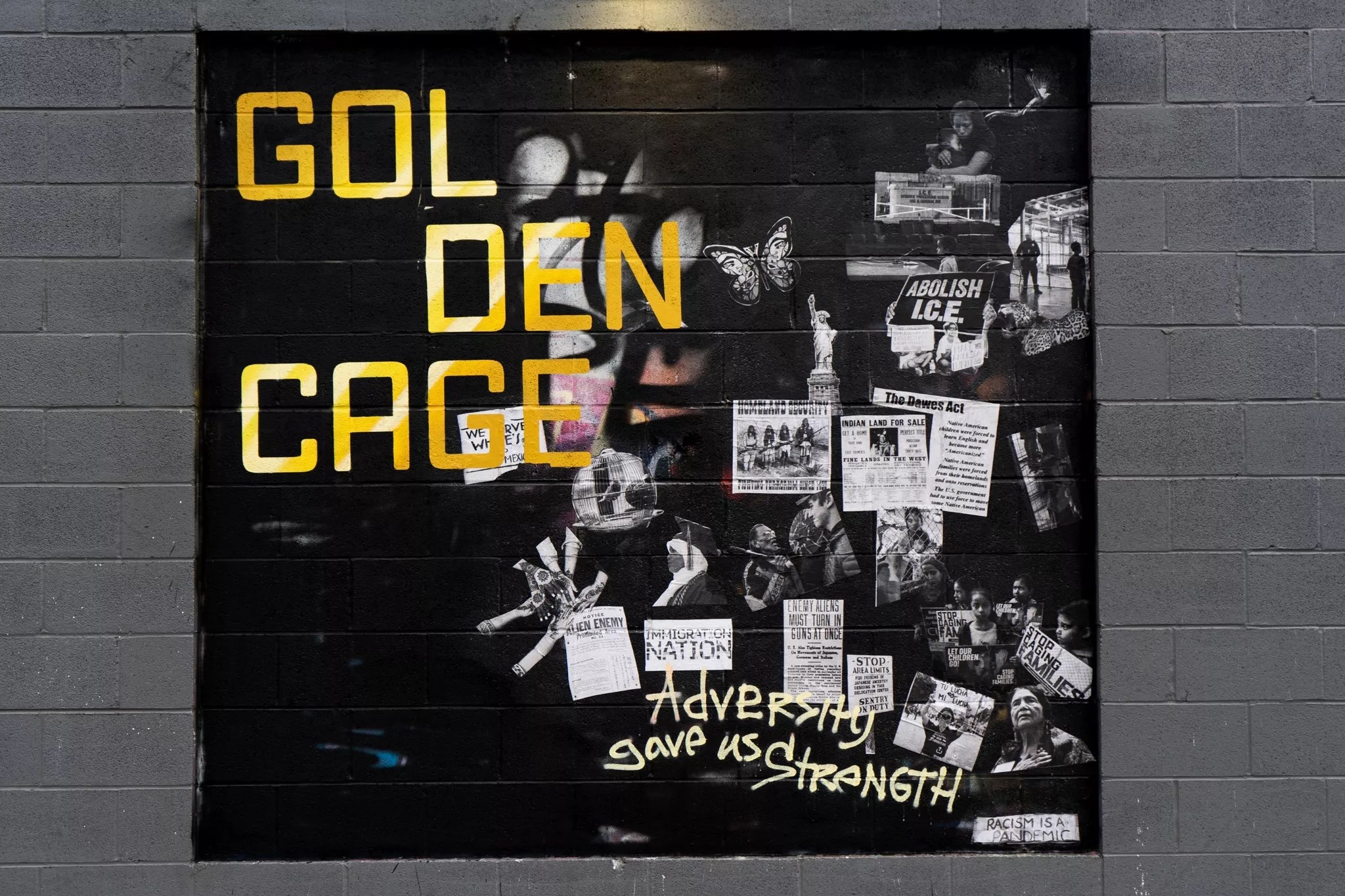 Each panel addresses a different cause, she says. The first, “Invisible Shackles,” has images related to slavery, the school-to-prison pipeline and African-American revolutionary struggles, from the fight against Jim Crow to protests against the police murder of George Floyd. The second, “Golden Cage,” is about immigration; the title is based on a term used within immigrant communities for the lack of healthcare, education, travel and job resources in the United States, explains Chavez. The third, “Home,” addresses homelessness and poverty, with messages about empathy and mental illness. And the fourth, “Bias,” is about a variety of injustices, including sex trafficking and gentrification.