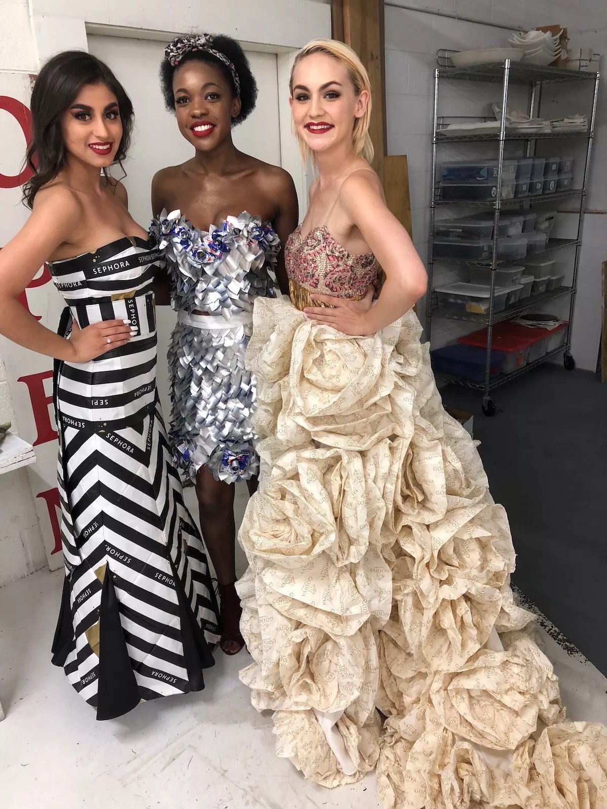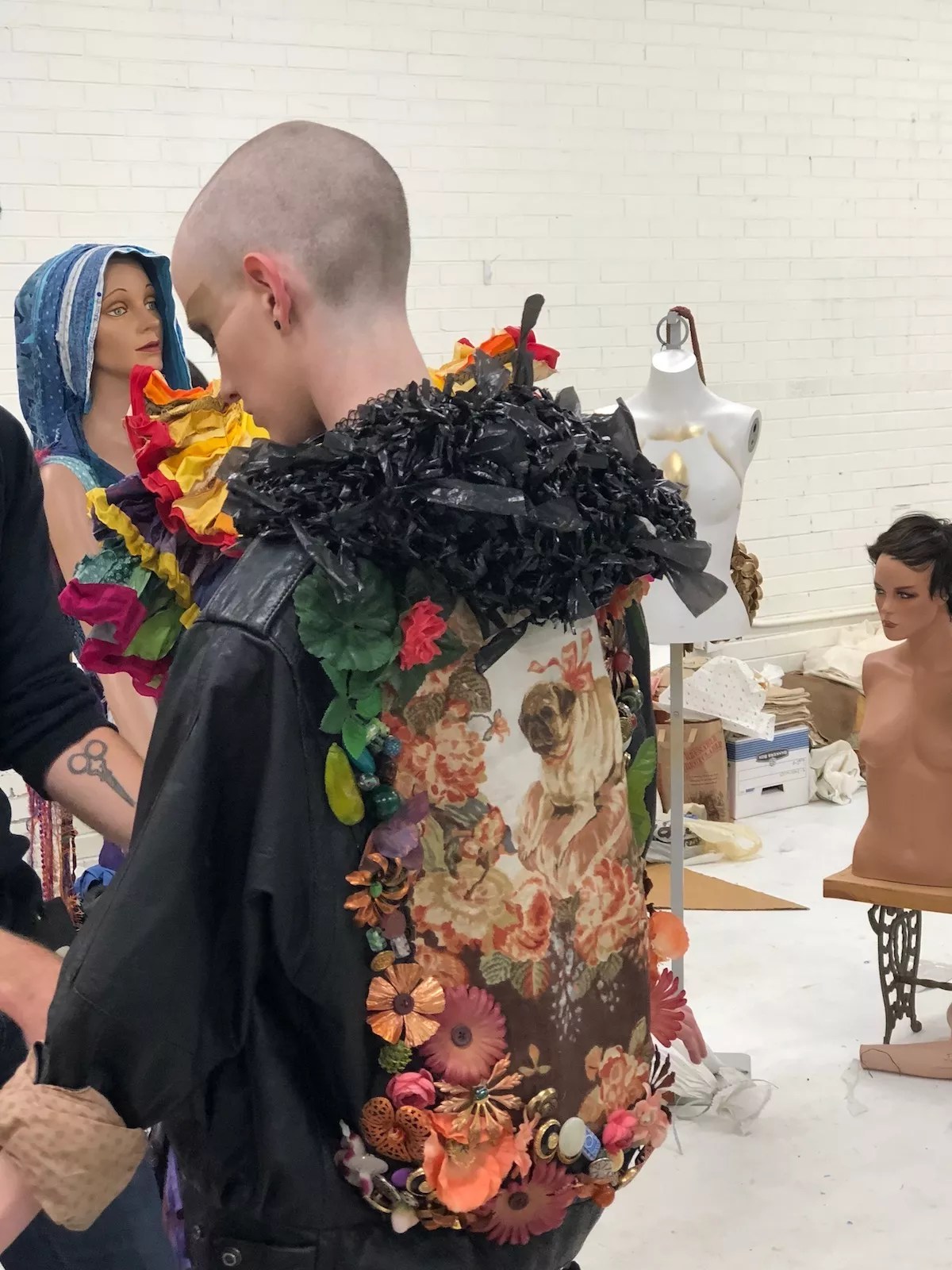 “We’ve been having fun with it,” Hanzon says of the process. “All the designers have been working in the studio. People have stepped up to donate some beautiful trash, and some of our designers brought gorgeous fabric scraps.” And, he has to add, “I’m glad we have an industrial sewing machine in the studio. And zip ties.”