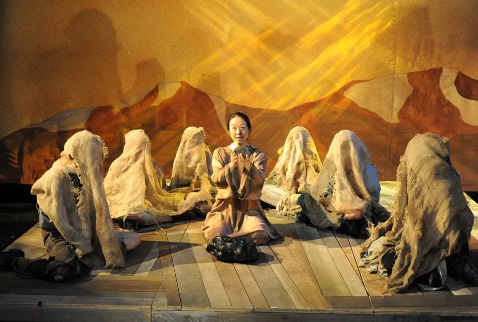 Margaret Kasahara, in performance in Ludlow 1914 as Ancient Woman/Teacher, LIDA Project/Theatreworks.