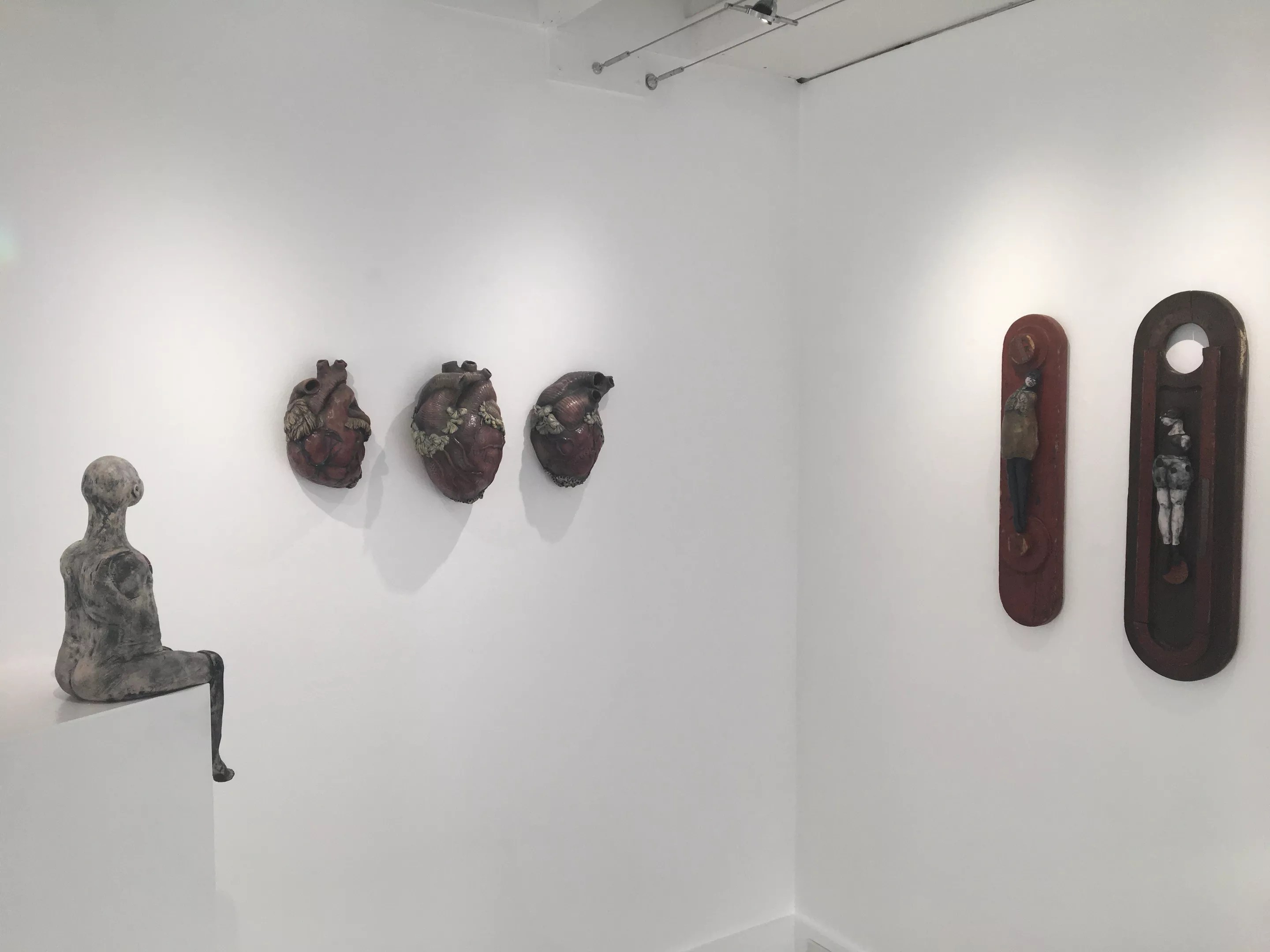 Installation view of a ceramic sculpture and wall reliefs in Touched/Marie EvB Gibbons.