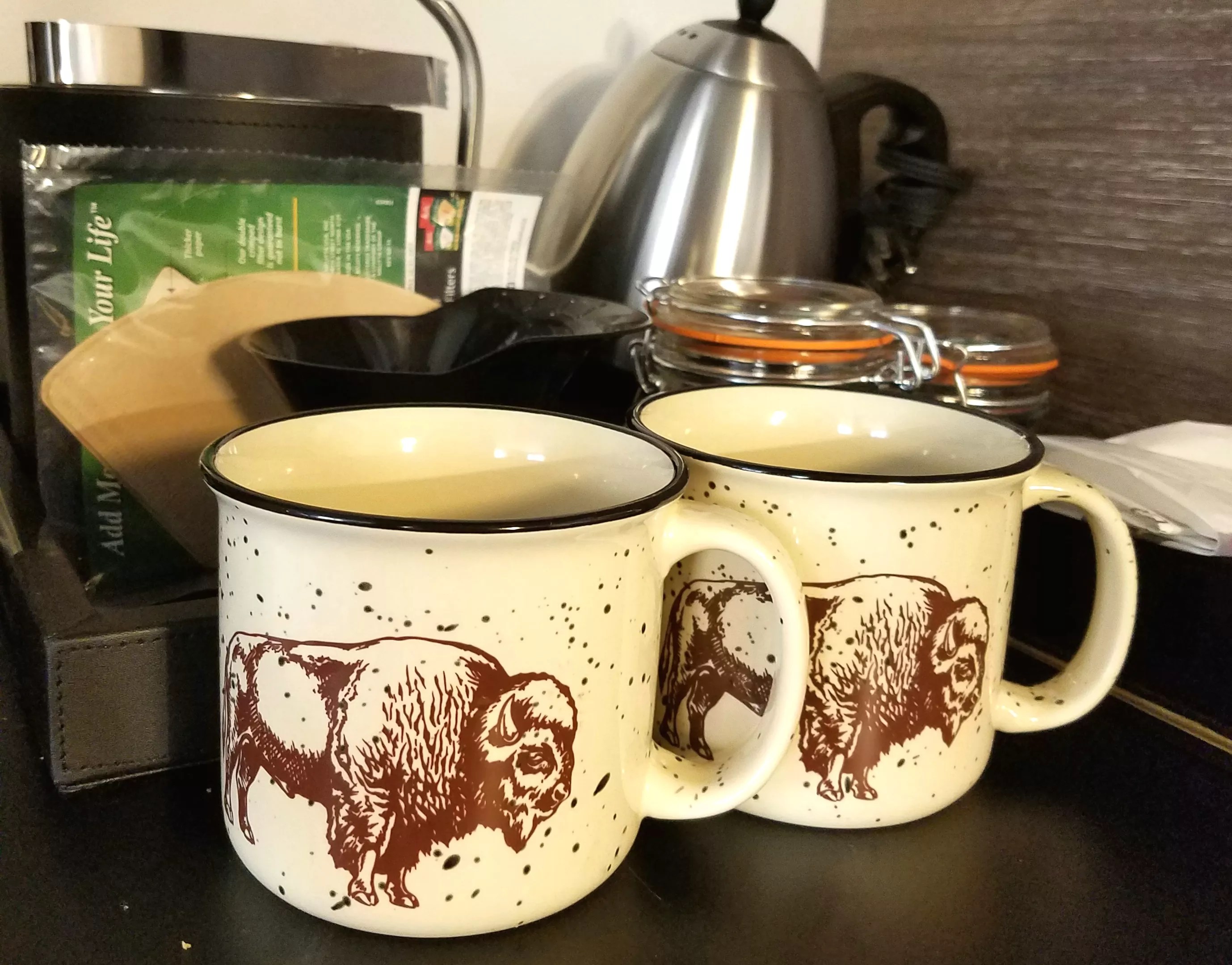 Each room’s beverage station is equipped with unique mugs by Counter-Couture.