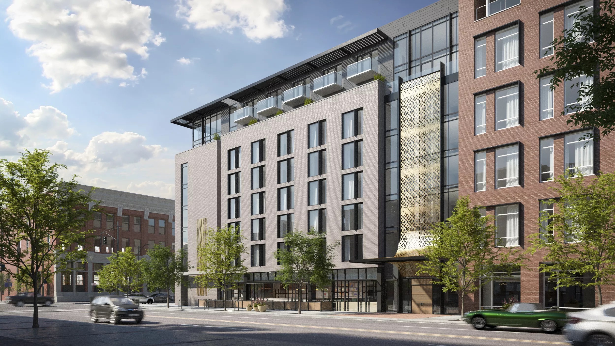 There’s more art on each floor. Heather Oelklaus, a Colorado Springs-based artist, has turned black-and-white photos of a ladies luncheon into a quilt-like print. Each level also features a whimsical painting by Karrie York, with lively foxes wearing human hats; the seven-piece series reflects the collection’s vague animal theme. You can spot more critters in Valerie Savarie’s gorgeous book cutouts; her installation isn’t actually in the Maven, but near the business elevators on the adjacent side. That area also includes Diego Rodriguez’s three-dimensional abstract mural (title to be determined).