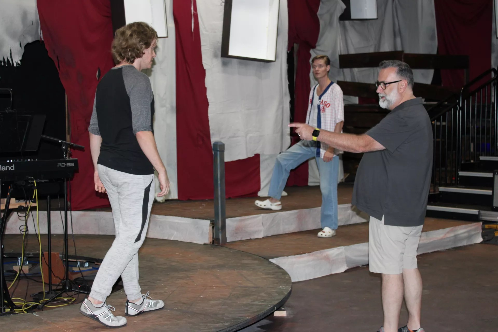 Warren Sherrill (right), director of Assassins, works with his cast to refine the musical’s staging.