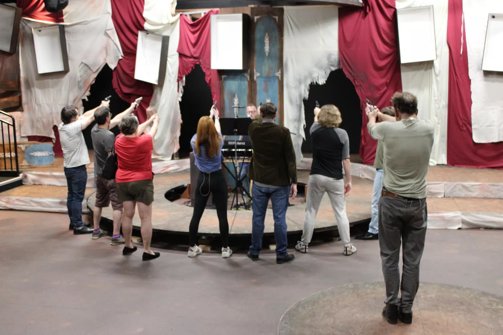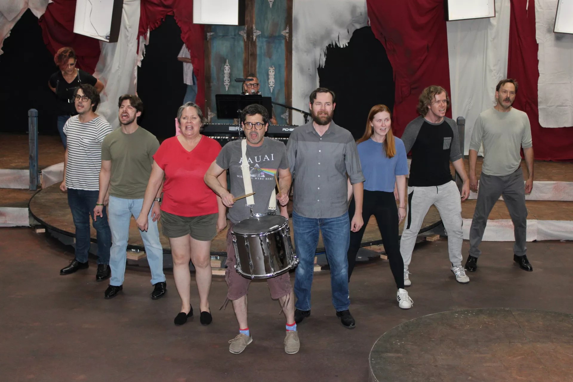 The cast of Miners Alley Performing Arts Center’ production of Assassins practices the first musical number.