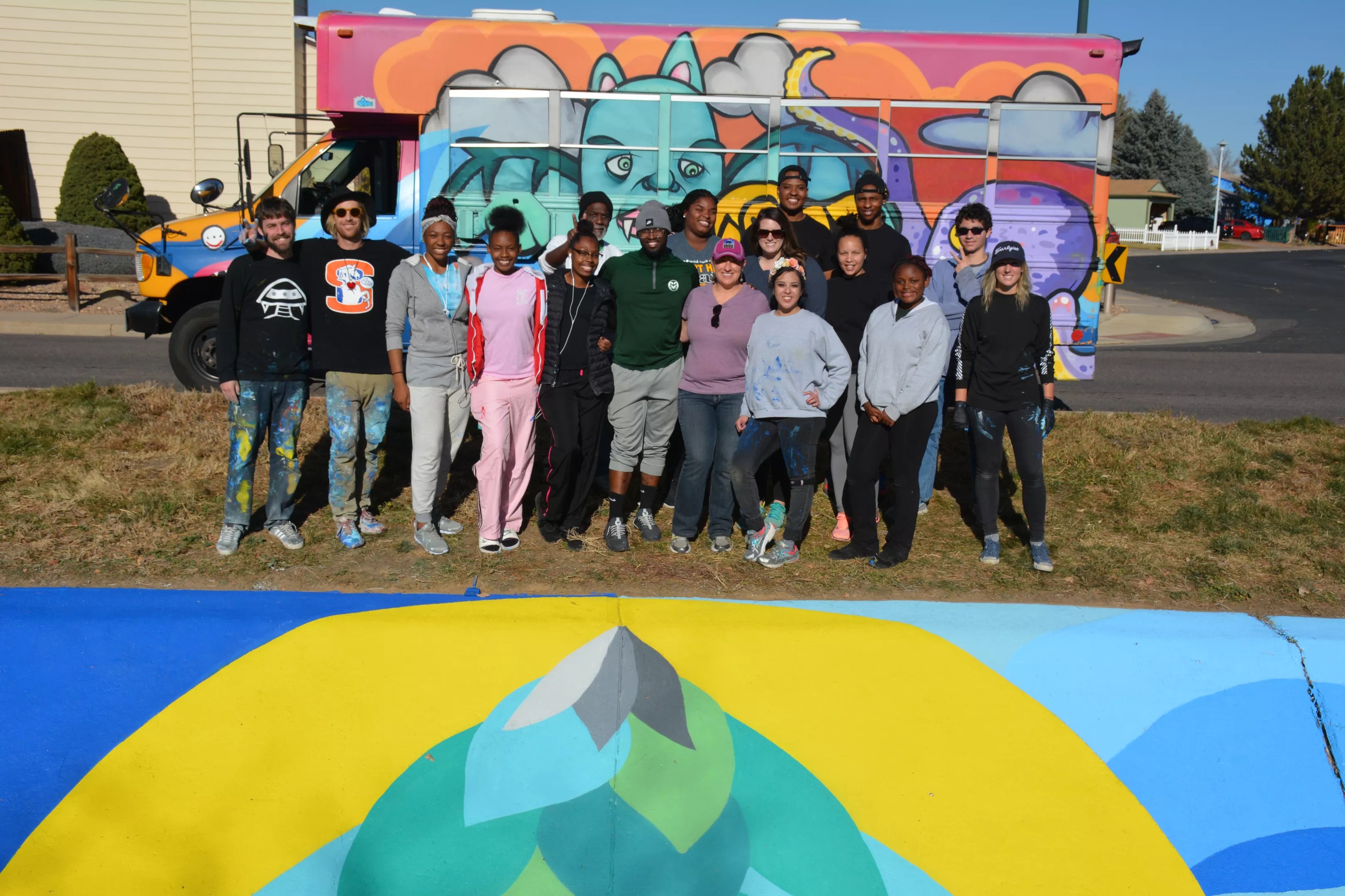 On November 9, 2017, Milbery and colleagues Pat McKinney, Hunter Stevens and Remington Robinson went back to the canal. Milbery and McKinney laid down a base-paint layer; the next day, the canvas was ready. The team sketched out the mural’s design, and students from the four schools located on the adjacent Montbello campus came out to paint. On November 11, Montbello community members joined the team for another full day of painting. And it was tough work, comprising back-to-back twelve-hour days. All told,125 volunteers ranging from students to senior citizens got involved with the project.