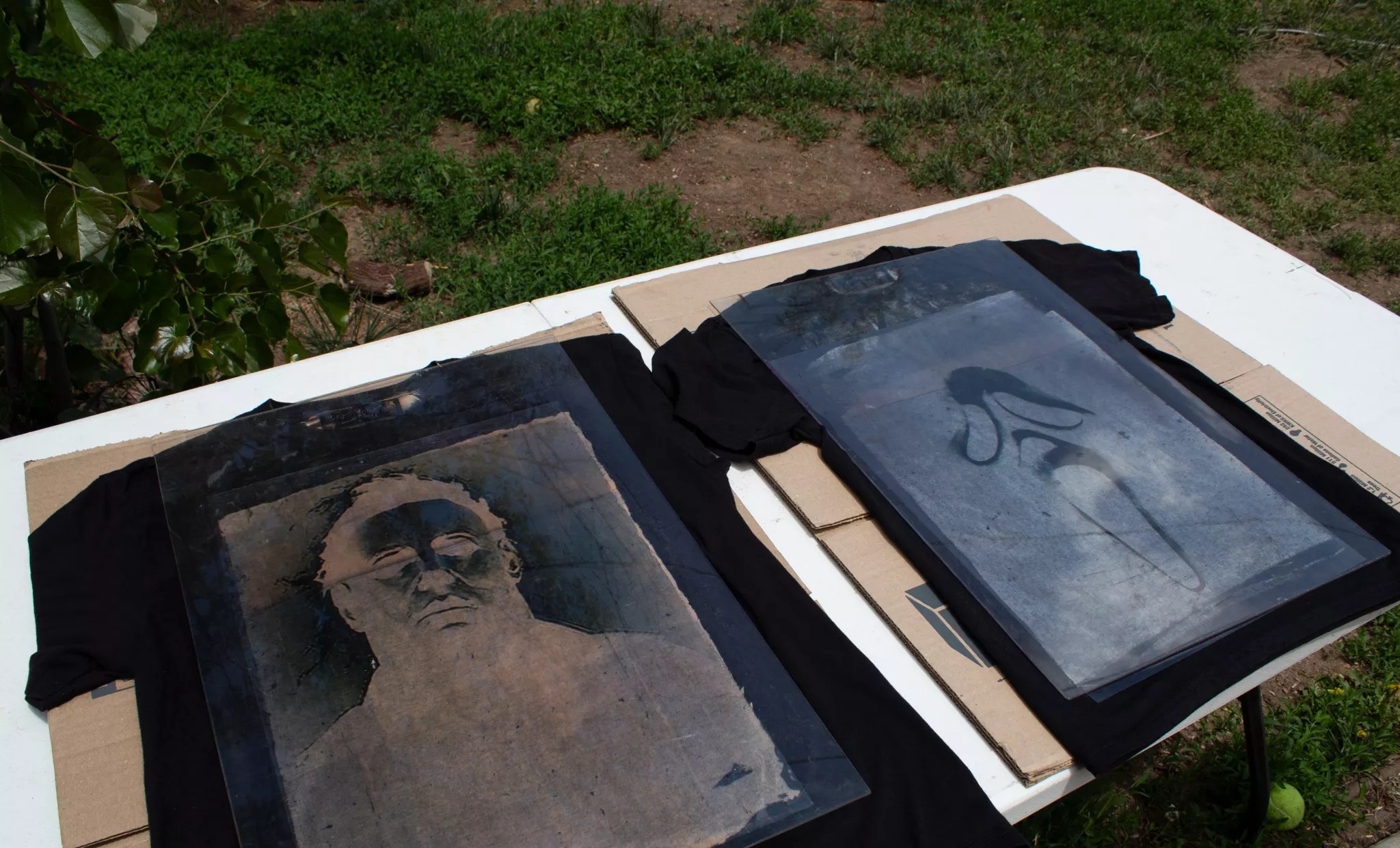 Next comes a layer of dye (which goes on clear), and then a negative photo printed on a transparent sheet is placed over the dyed area. After that, the shirt with the transparent photo spends a little time in the sun; depending on factors like overcast and UV levels, the shirts need only roughly five minutes to “develop” before they get a brief wash.