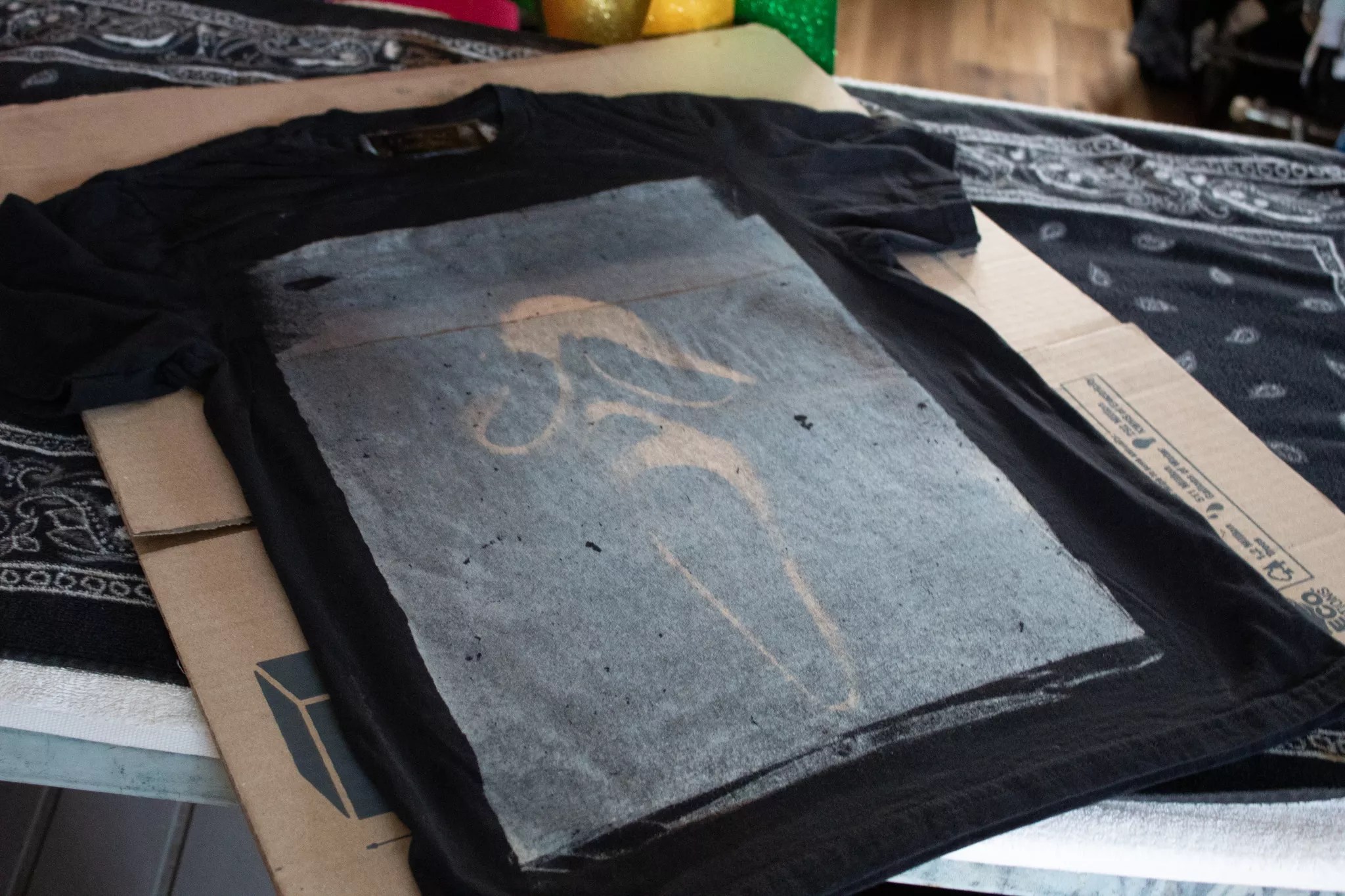 Now, he creates his merch in his backyard – about 25 shirts on a productive, sunny day. A shed has been converted into a studio where he prepares the shirts for their time in the sun, stores them before upcoming art shows and, while he’s working, streams horror movies or rock music to set the vibes and spark inspiration.