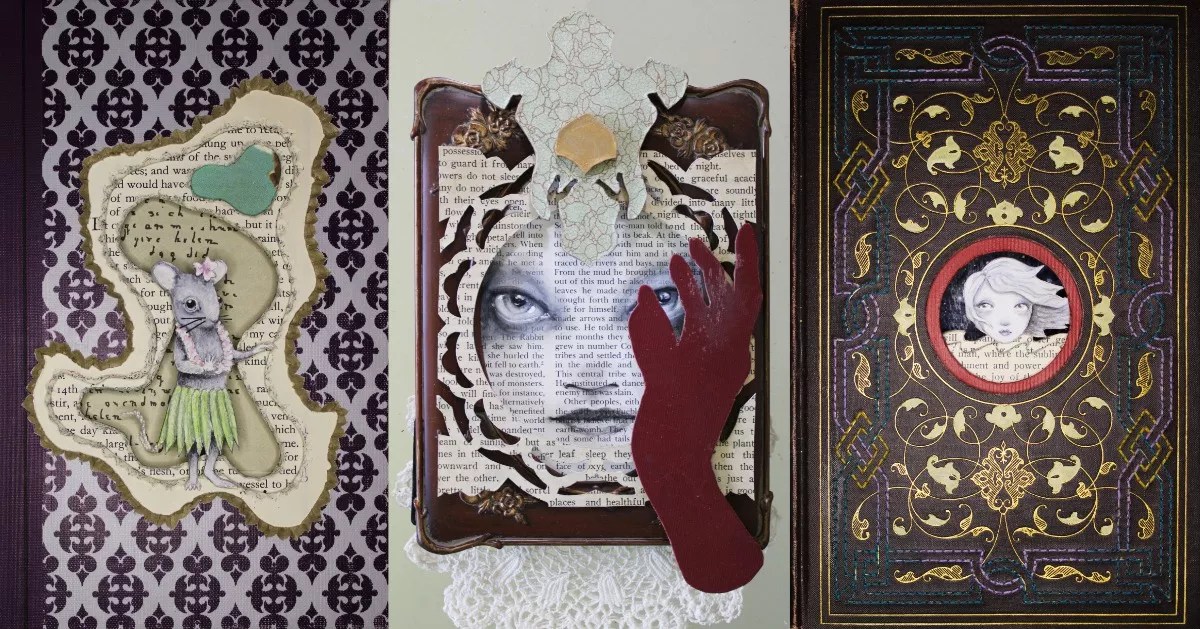 Valerie Savarie’s painstakingly carved book sculptures, which dig into the depths of an old book’s pages, commonly sport bold themes from stories and lore, but – as we are about to see – sometimes they don’t. Though she says they’ve mostly ended up “lost in my sketchbooks,” Potluck: Muse’s Choice comprises the fruition of some of her unfinished ideas.
