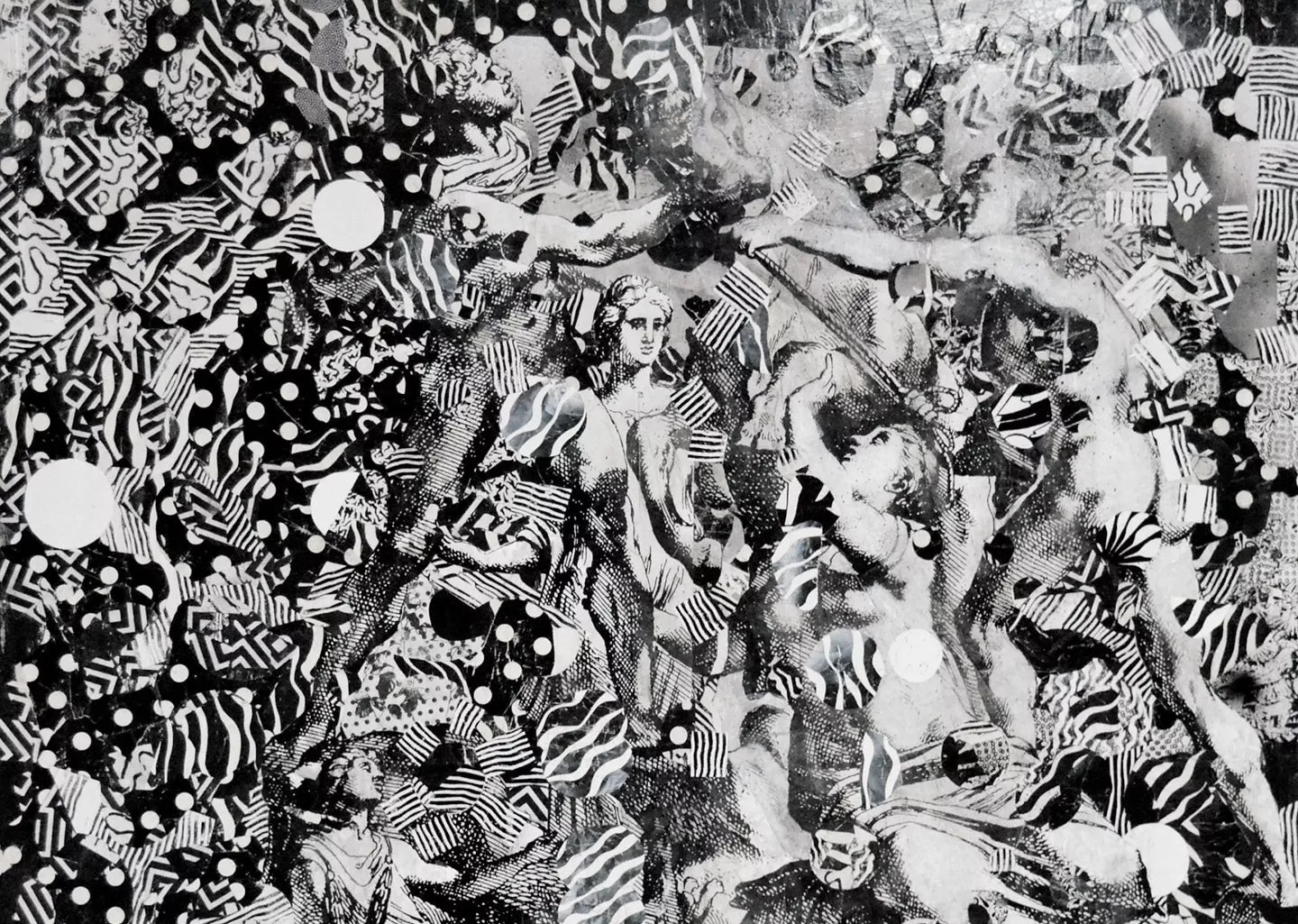 “I began to search for fifteenth- and sixteenth-century etching images from the British Museum. I was looking for a classical look, and wanted to pick images that were violent or showing struggle: imagery from ‘The Rape of the Sabine Women,’ imagery of Icarus and of men wrestling and Moses holding up the Ten Commandments. These are loaded images that most people will be aware of, used as points to start up a conversation. Rather than telling, I wanted to create imagery that people could look at and ask questions.”