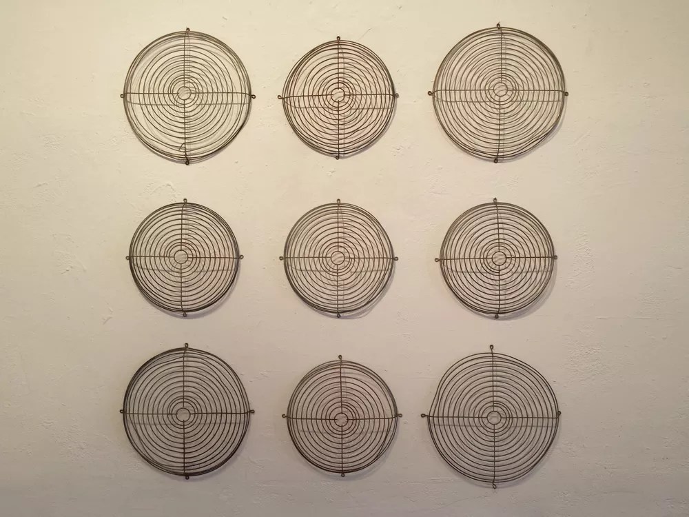 “Fan Covers,” by Phil Bender, found objects.