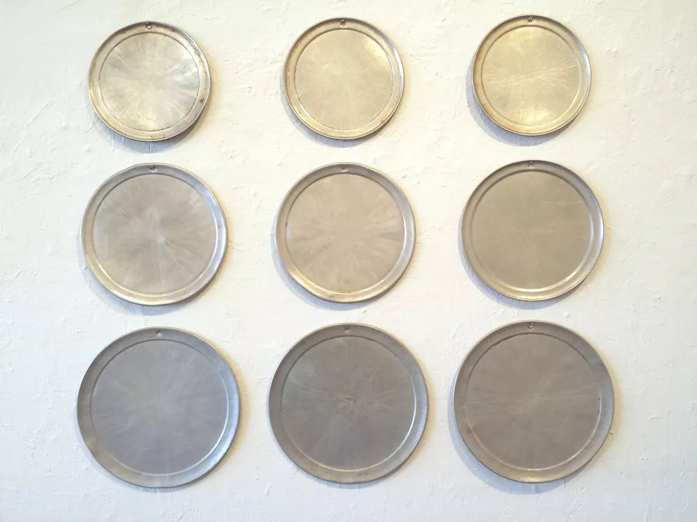 “Patsy Pizza Pans,” by Phil Bender, found objects.