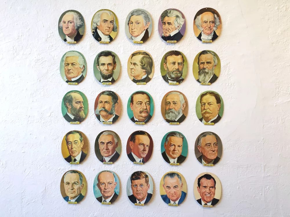 Bender’s current Pirate exhibit is extremely restrained and sparely installed by his established standards, perhaps given the impending relocation; this austerity reflects the somberness of the occasion. One standout is “Presidents,” a five-by-five grid comprised of oval cut-outs of presidential portraits on newsprint that starts with Washington and ends with Nixon, with many left out in between. Bender “borrows” the images but recasts them within his established vocabulary.