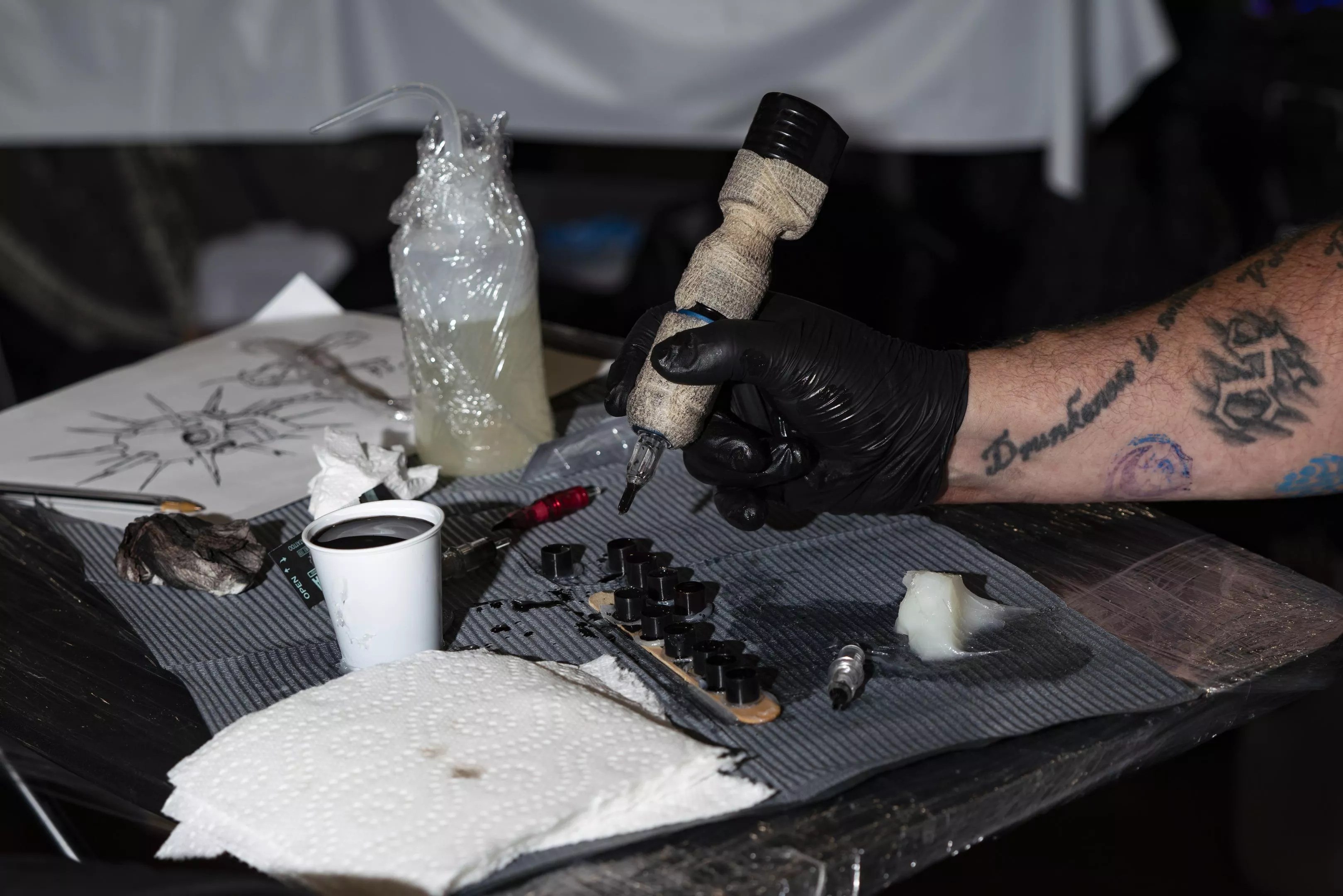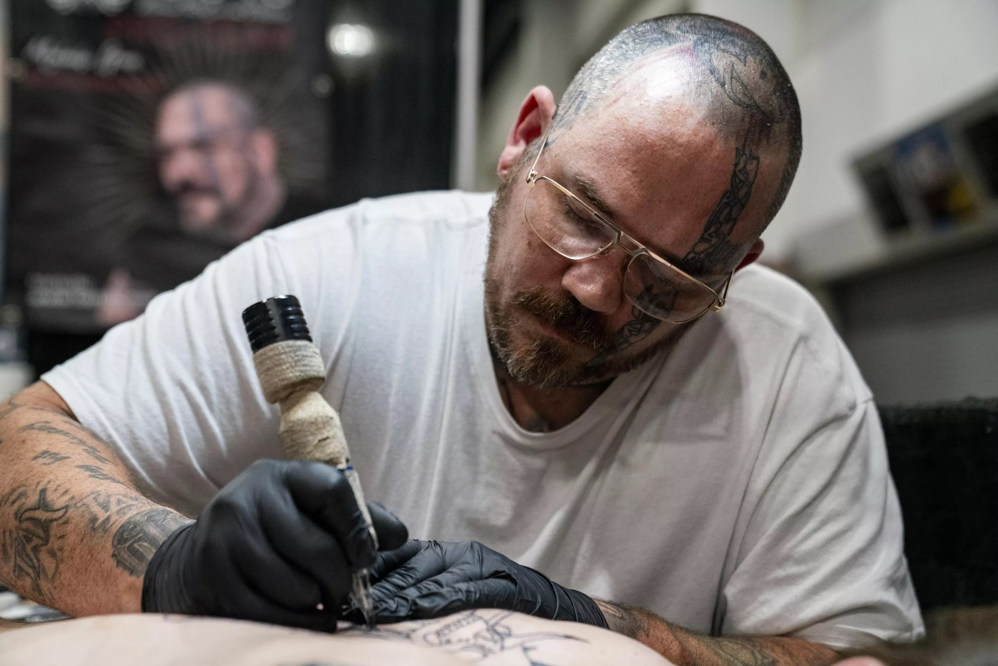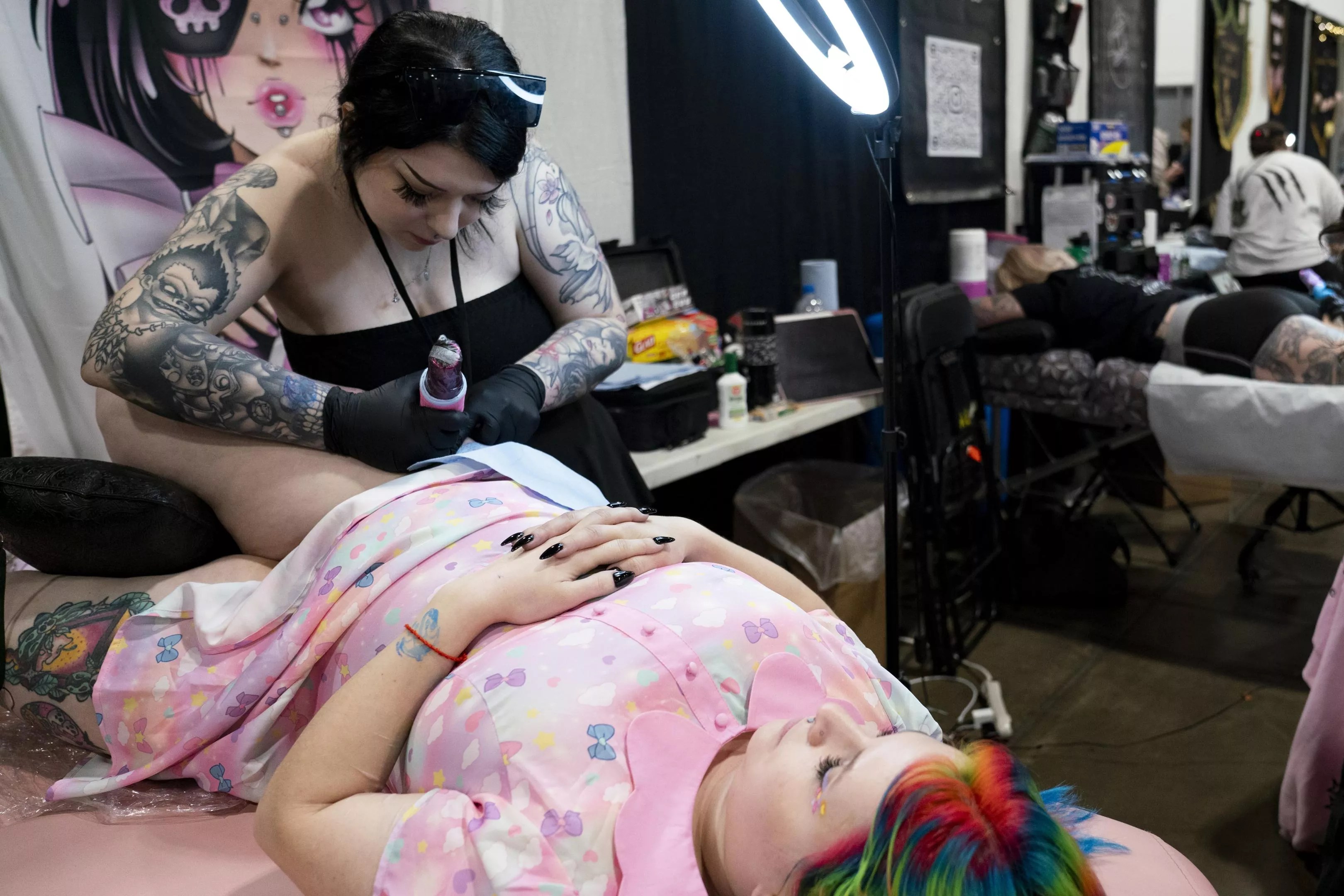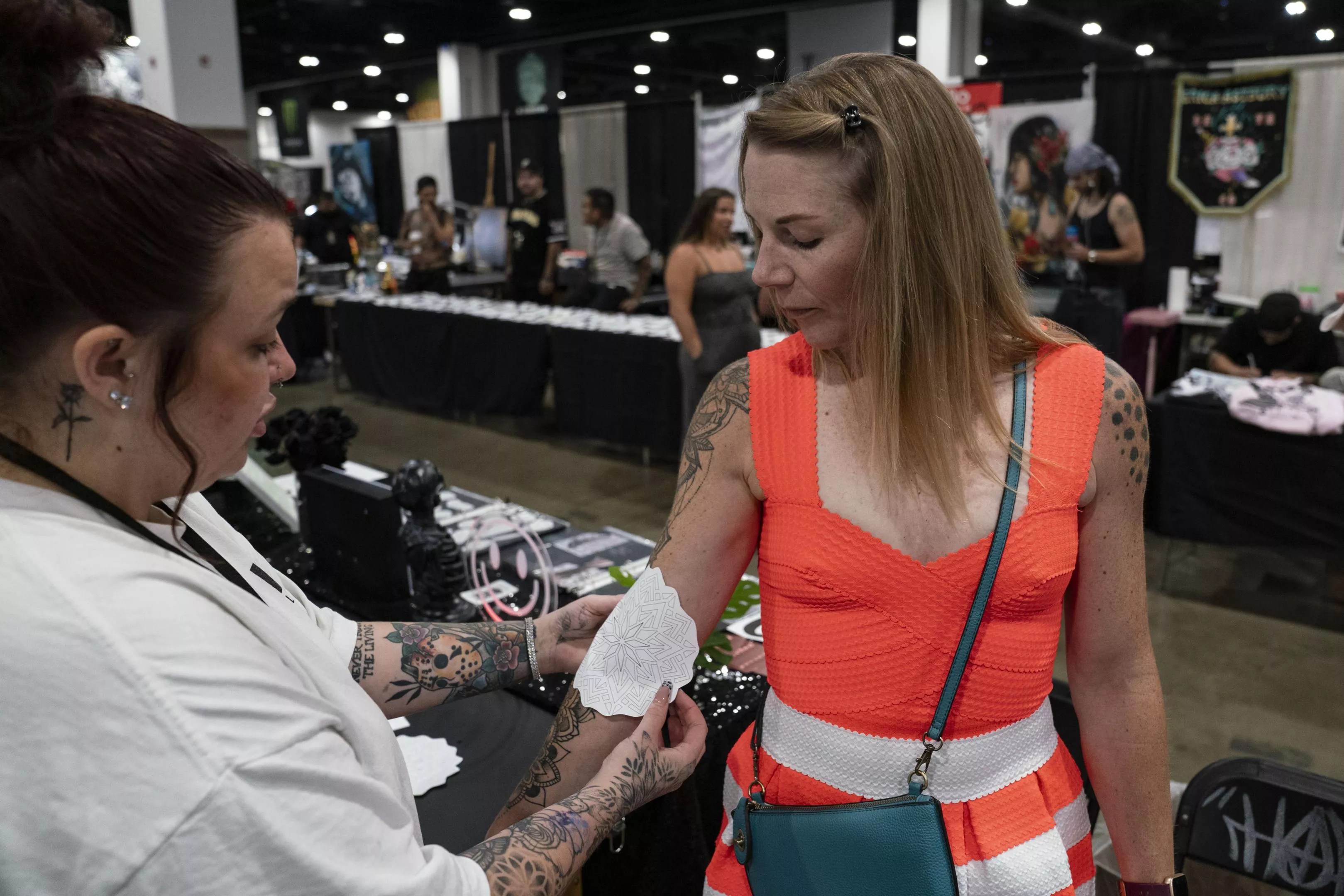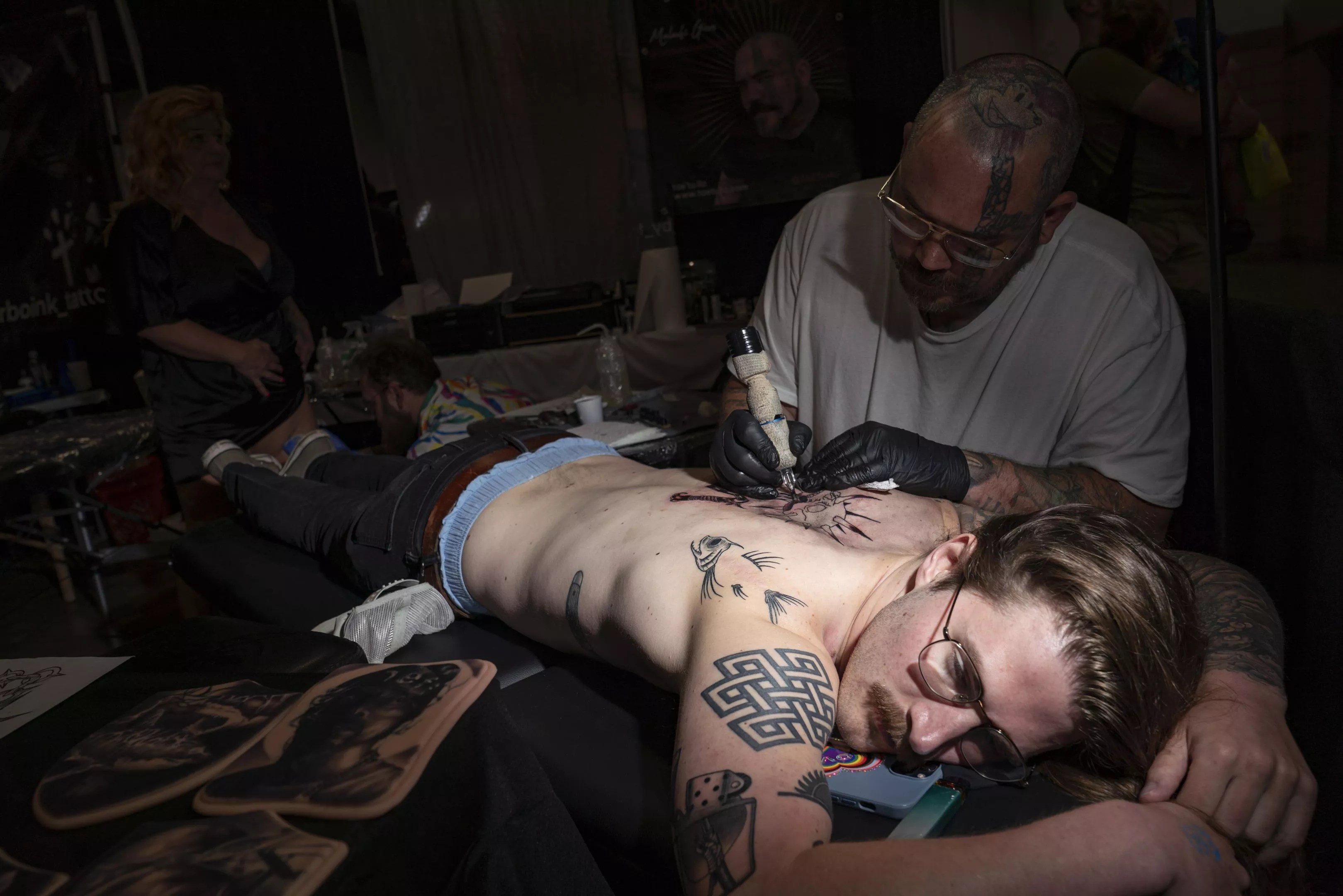 Cameron Edwards gets a tattoo by Malachi Green as people walk through the rows of hundreds of tattoo artists.
