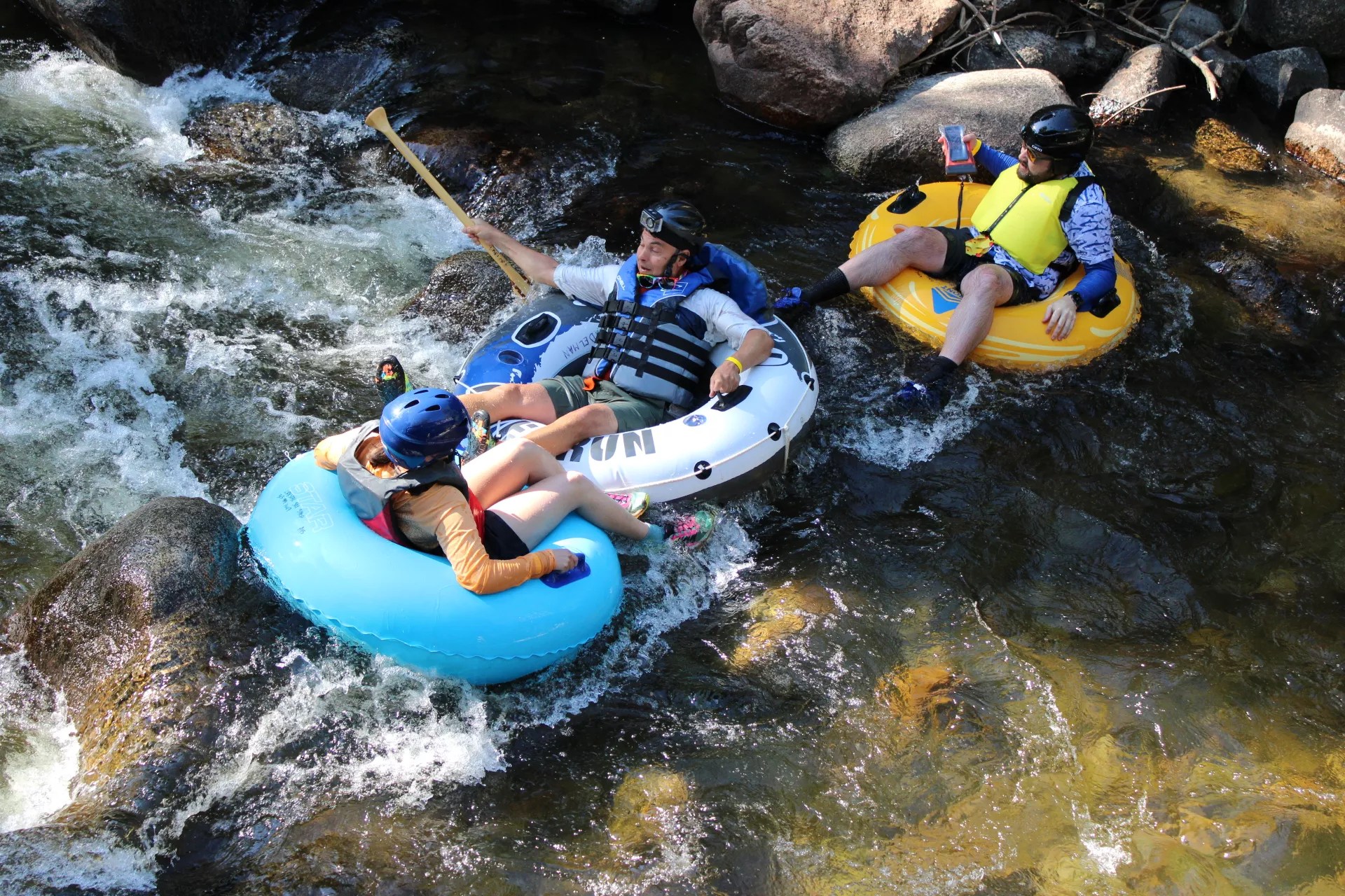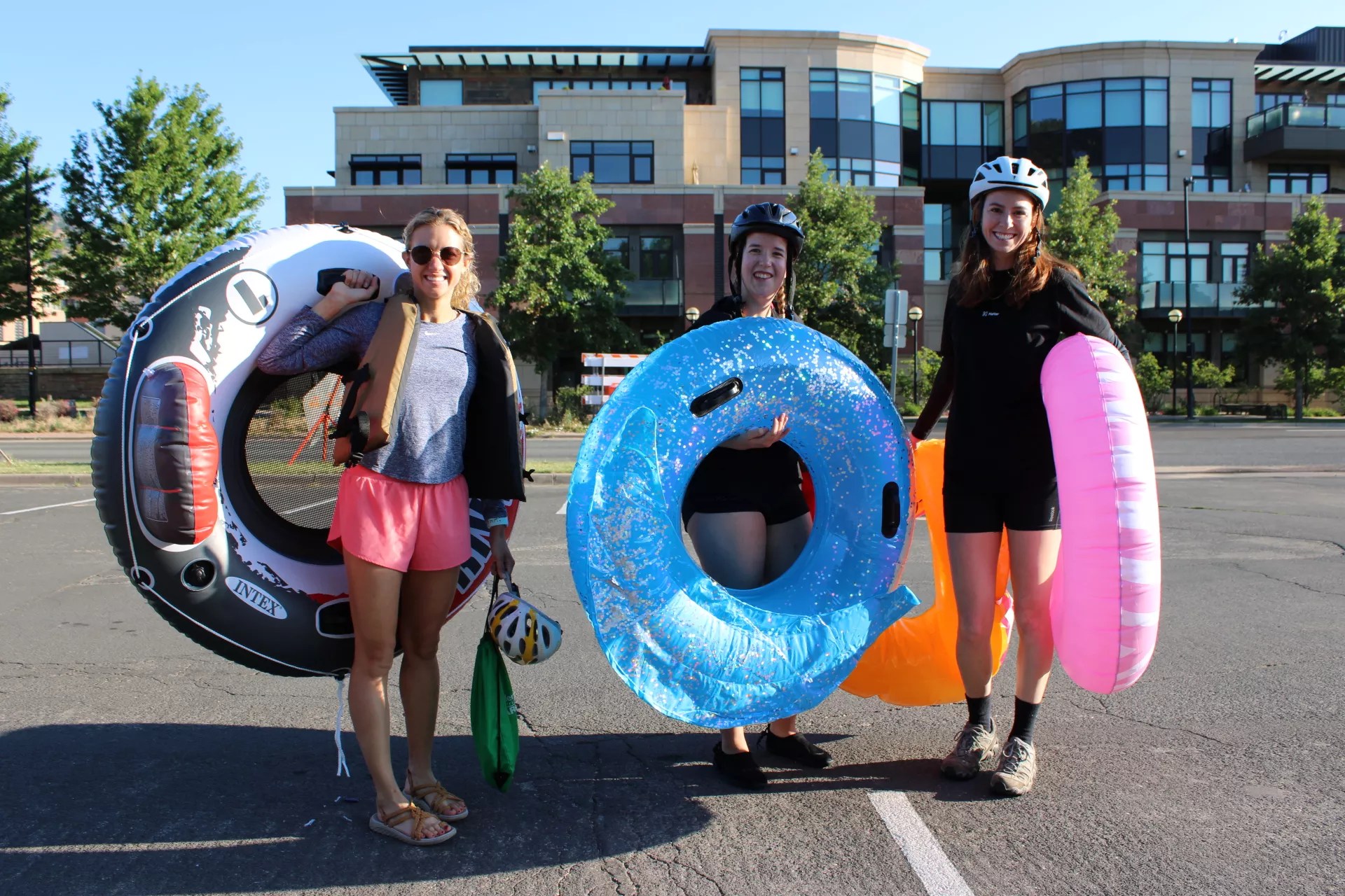 Three people pose with their tubes in a parking lot near Central Park in Boulder before heading to Eben G. Fine Park.