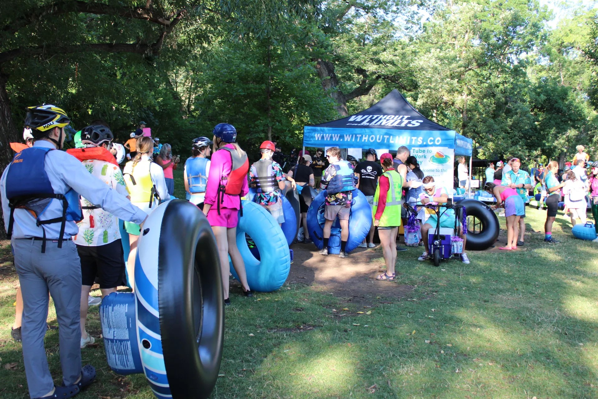 People gathered in Boulder Creek for the 18th Tube to Work Day.