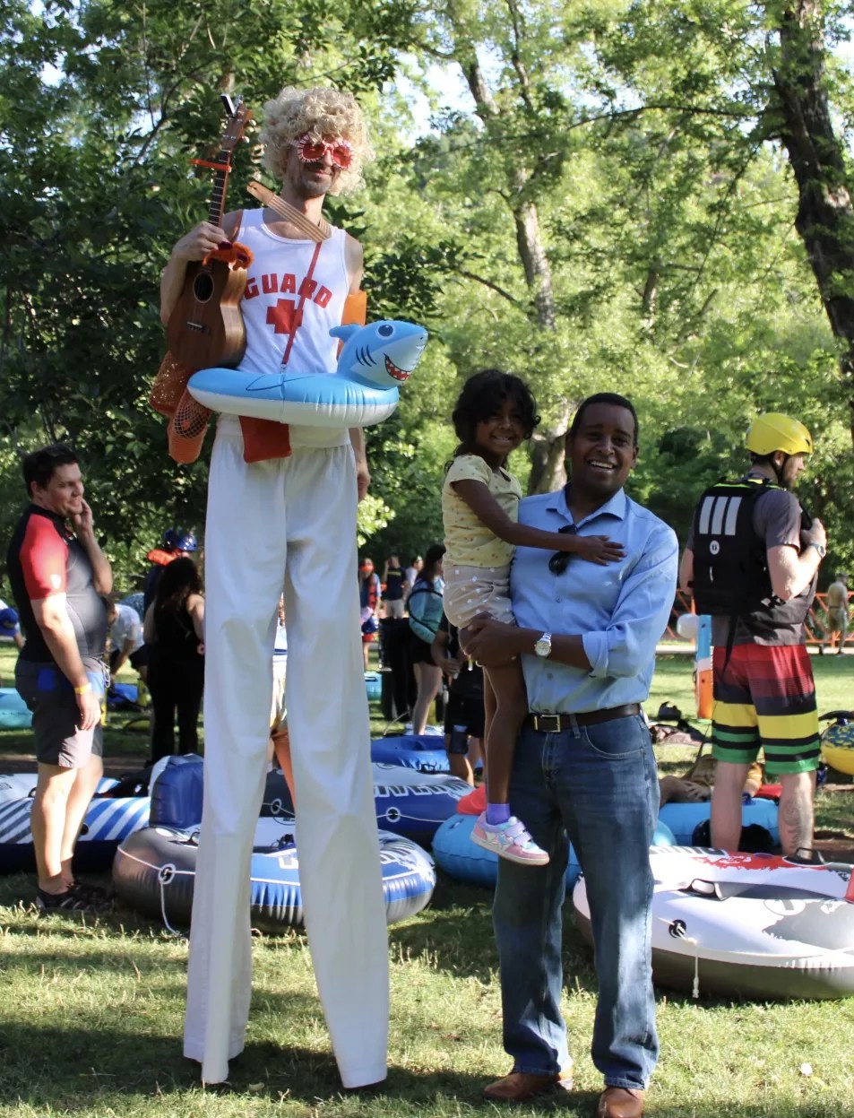 Attendees began trickling into the Eben G. Fine Park around 7 a.m., greeted by games, dancing and a stilt-walker parade. The weather cooperated: clear skies, mid-60s temperatures that rose to the low 70s and no wind made for ideal tubing conditions. First-timers and seasoned veterans mingled as they inflated tubes, zipped wetsuits under their collared shirts and mingled with others about to take the plunge.