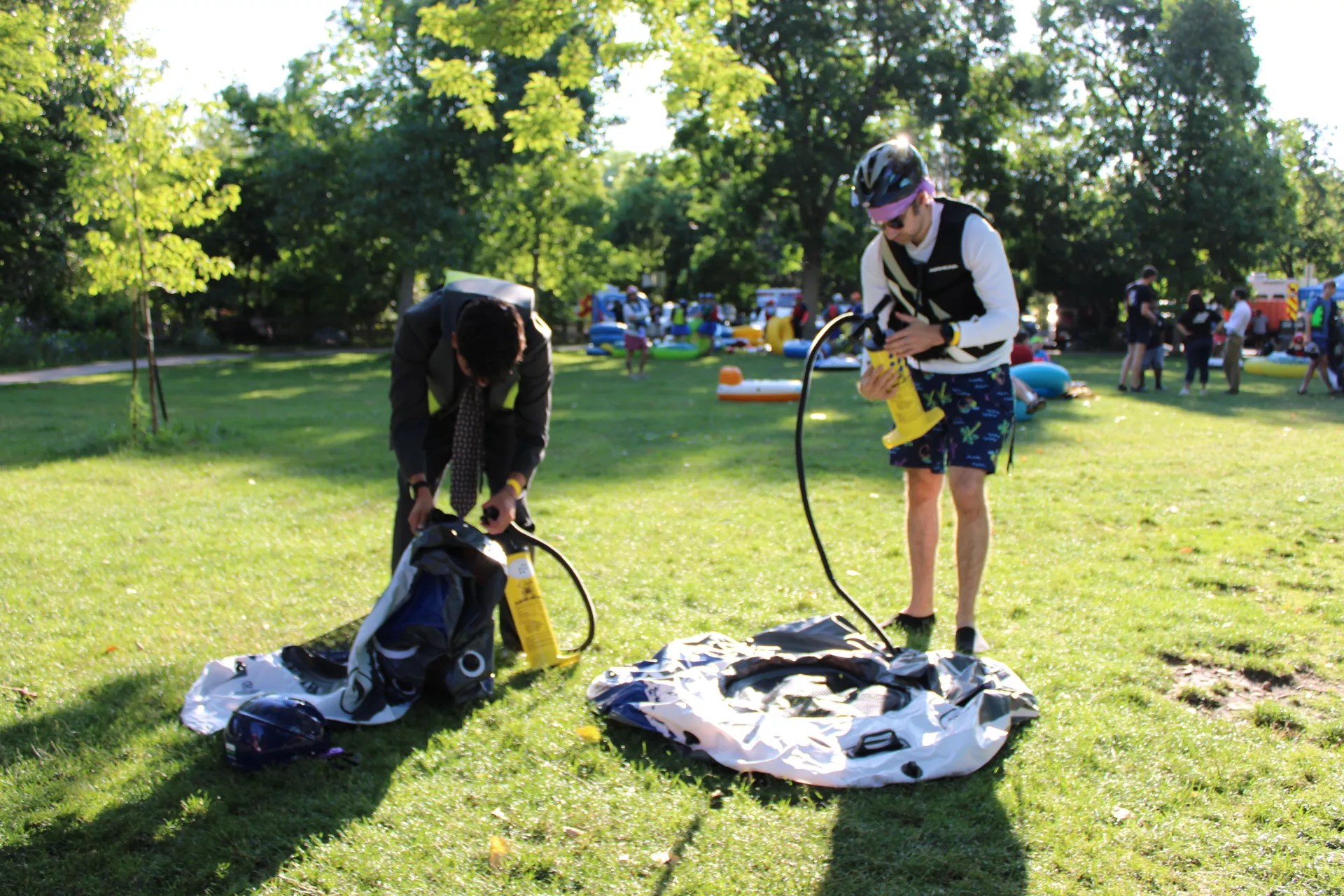Two people inflate their tubes prior to the event.