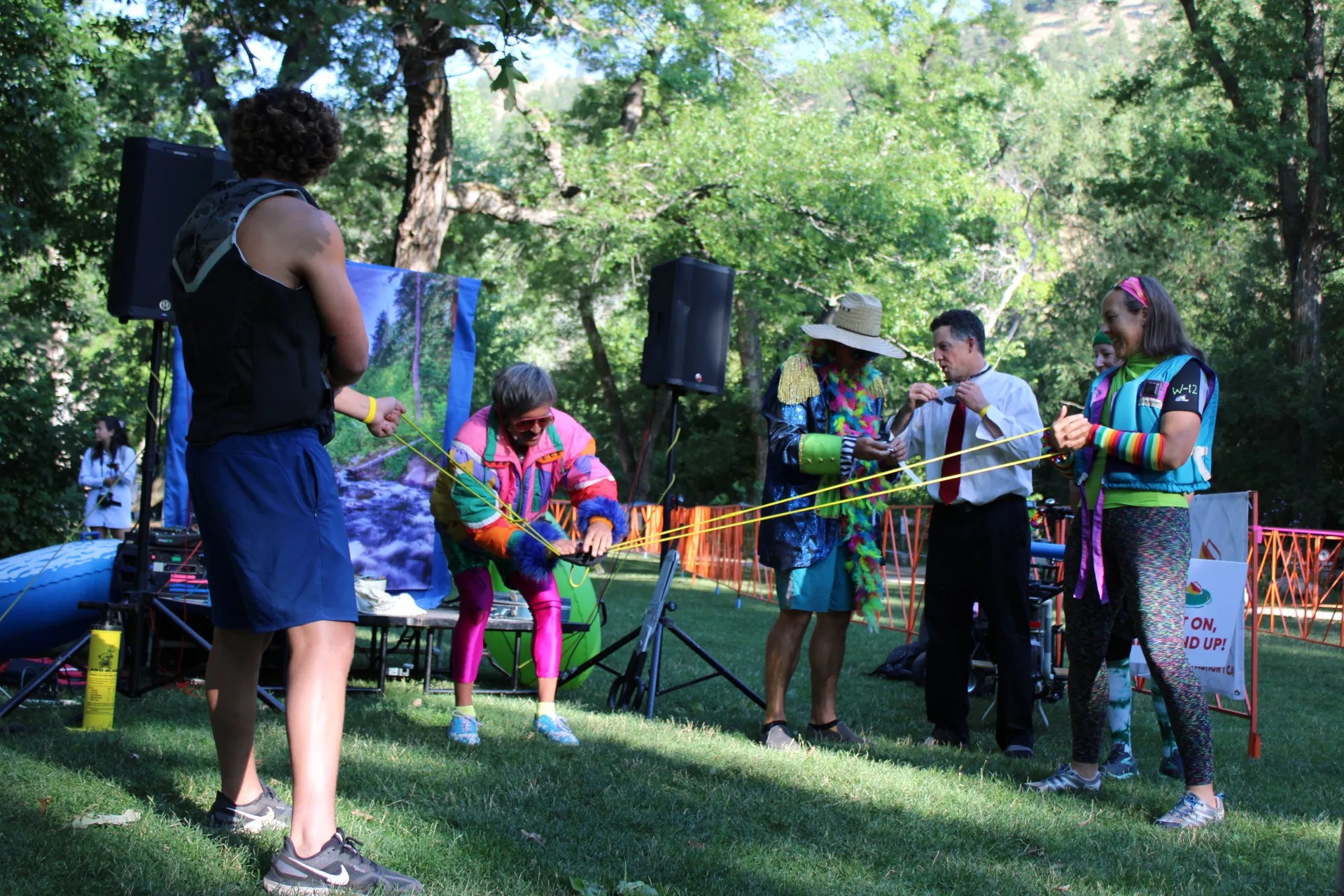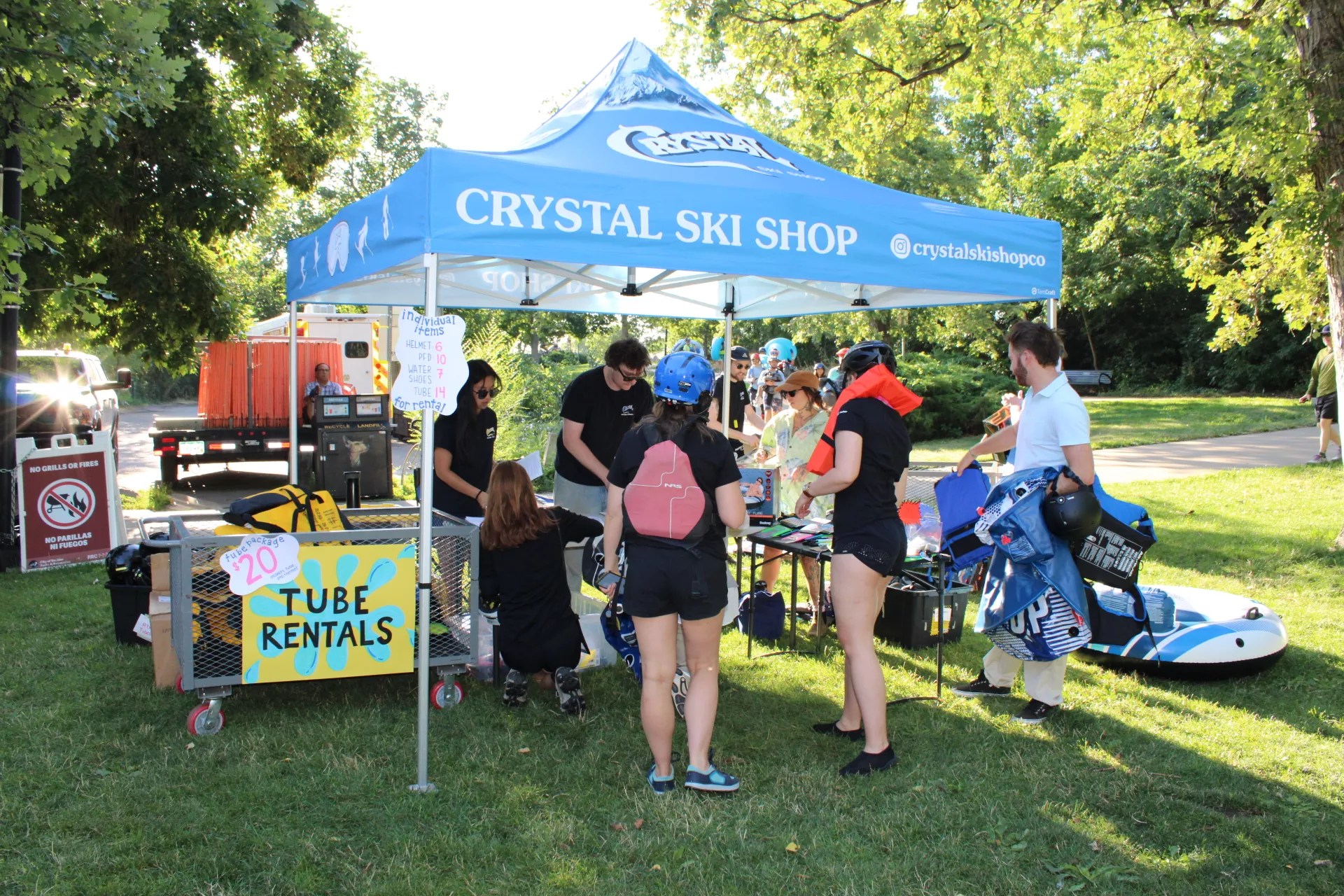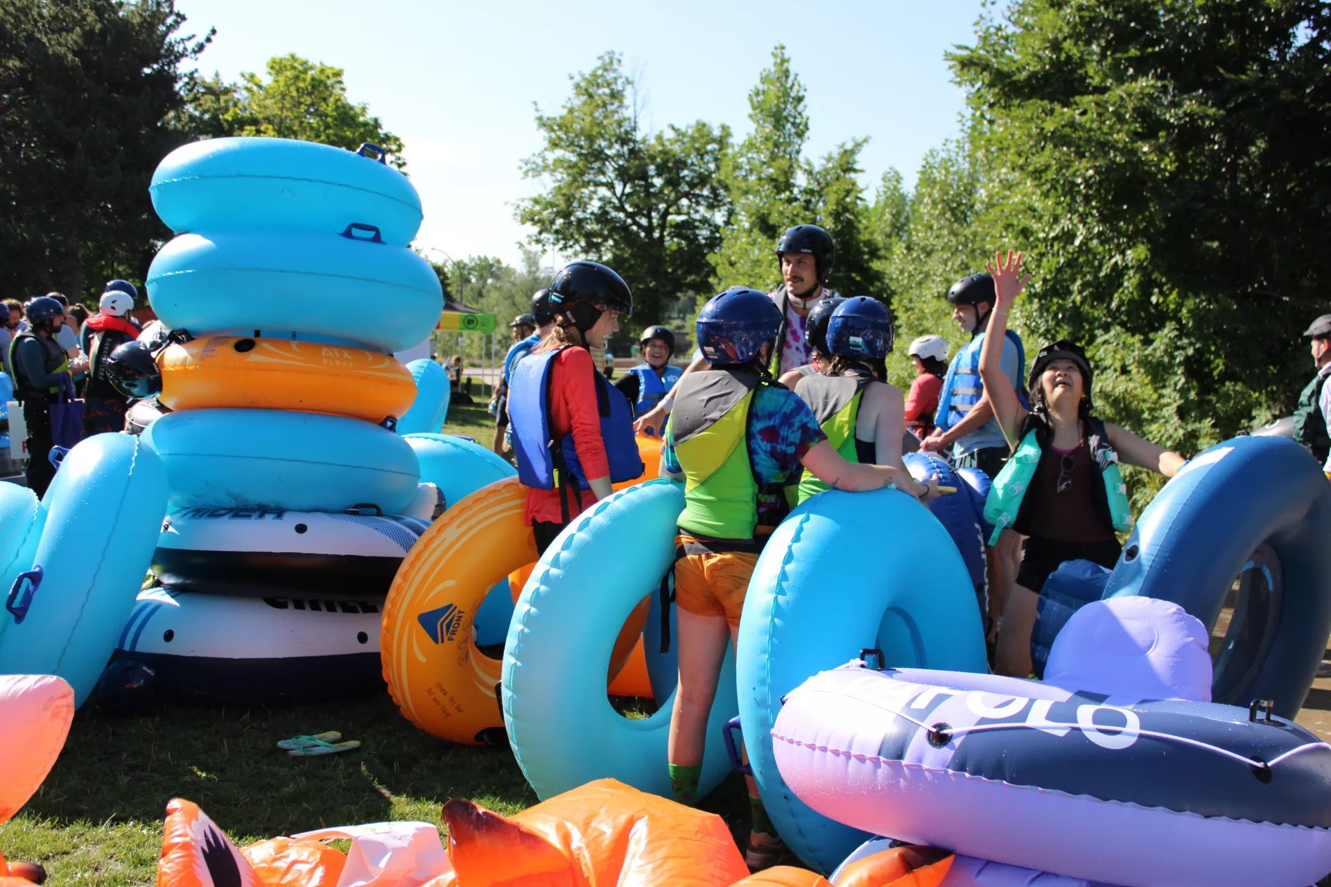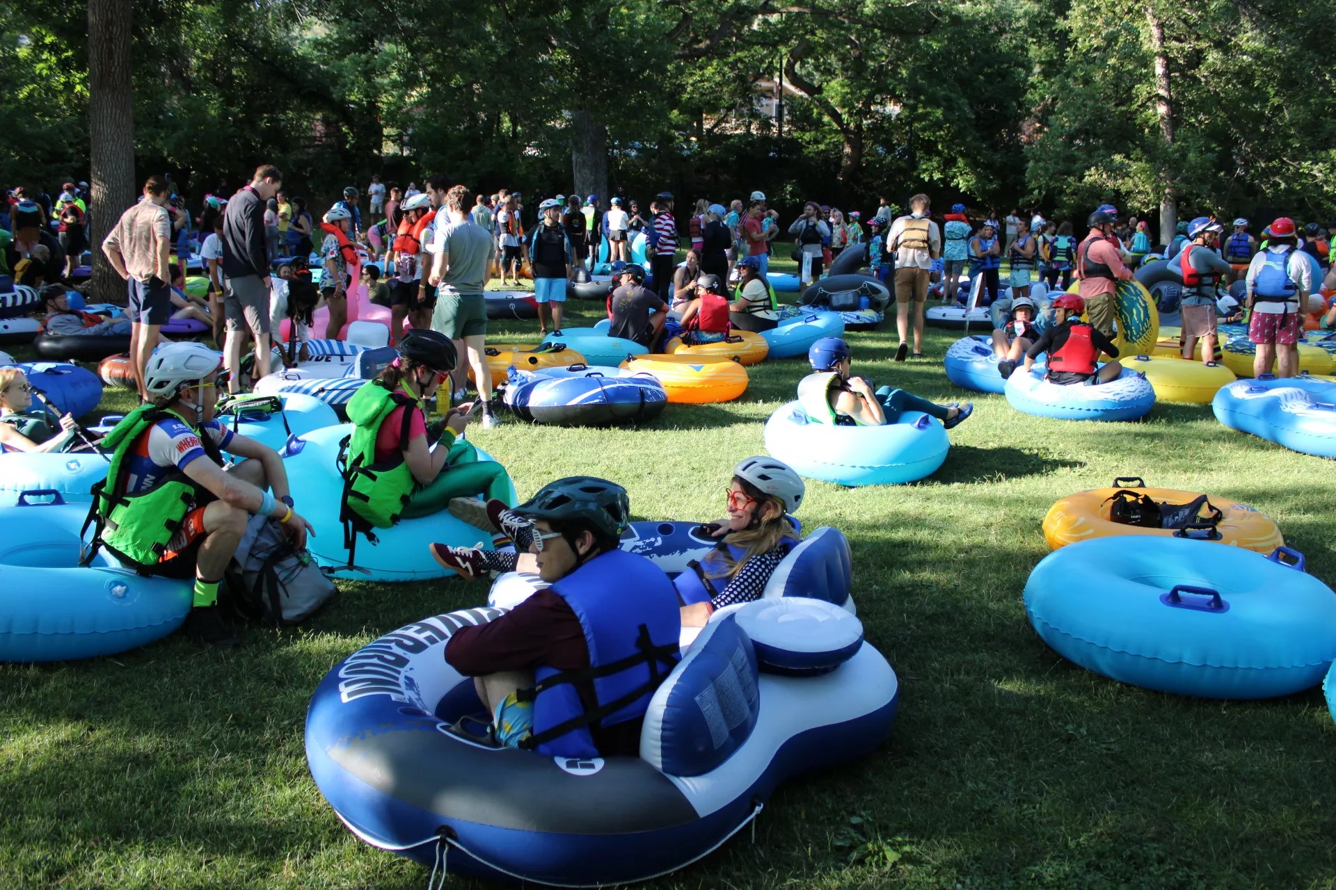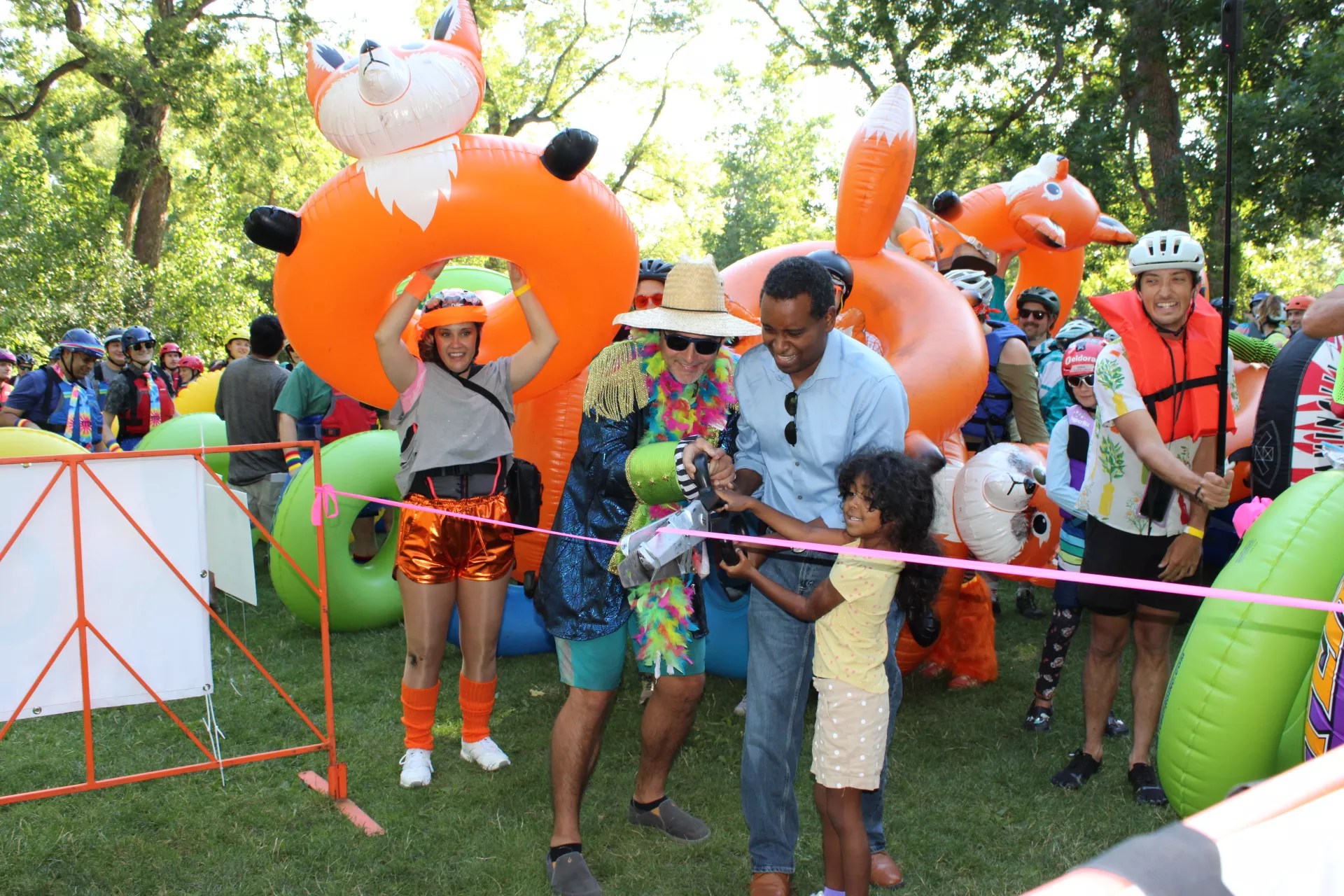 At 8:15 a.m., a ribbon duct-taped to a saw blade was sliced in half by Neguse and Schuchard. With wristbands raised and helmets buckled, waves of tubers launched into the current. Some paddled in sleek river gear; others grinned in dripping button-downs and wacky costumes.