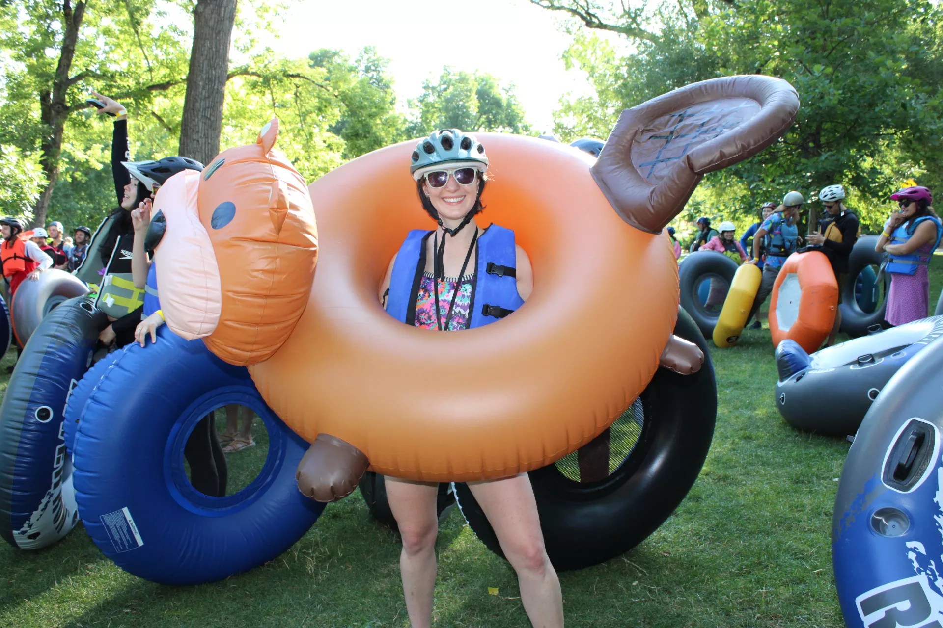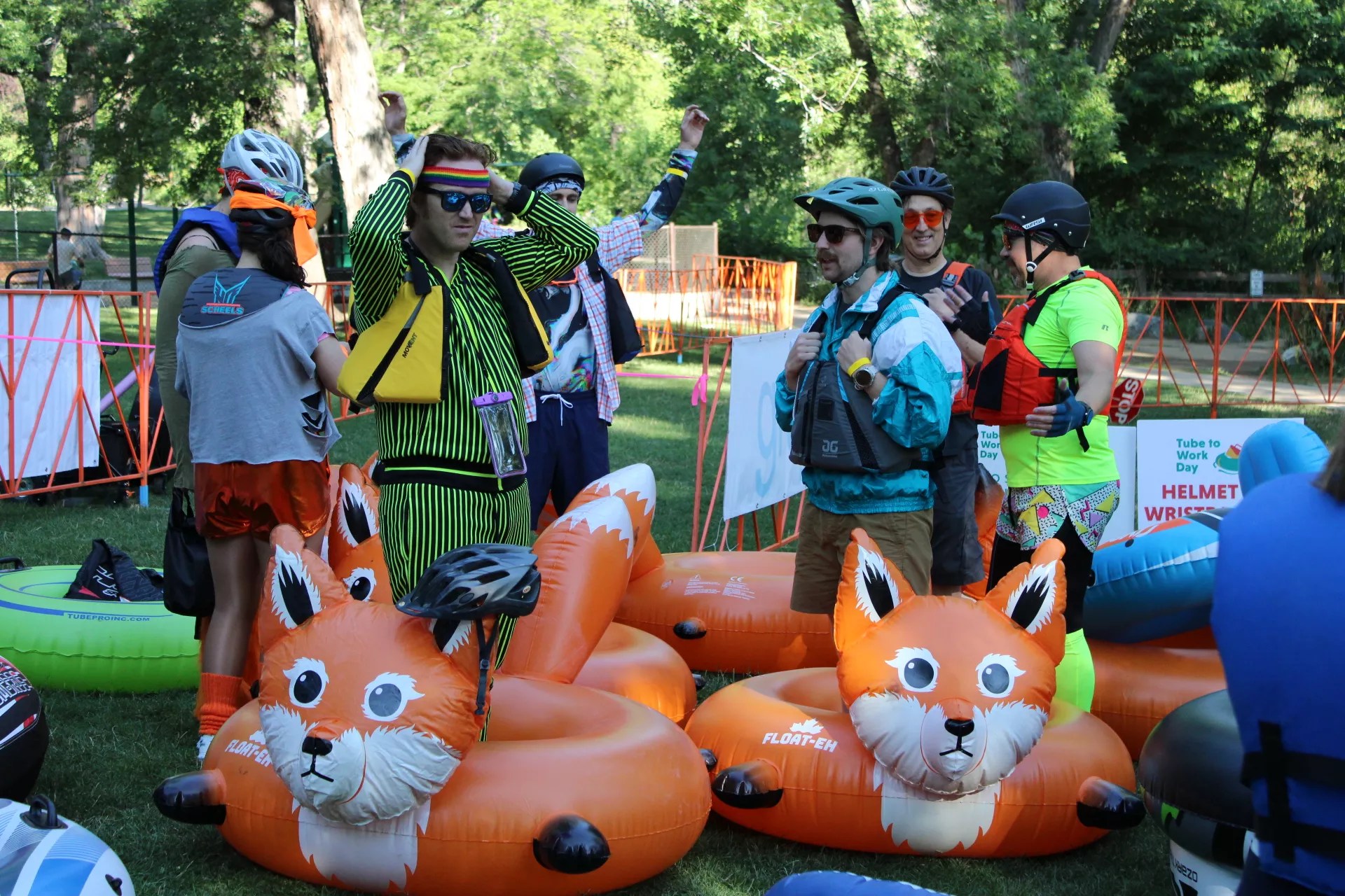 A group of friends stands near their fleet of fox floaties, which won one of this year’s Best Tube awards.