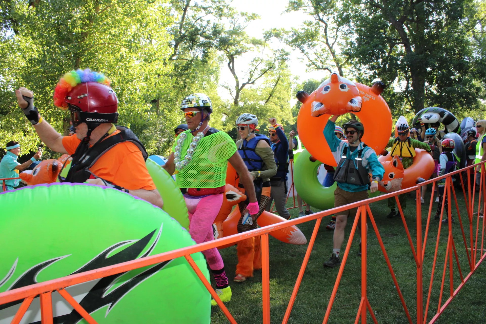 A few lucky participants walked away with prizes before the send-off. This year’s Best Tube awards went to a giant inflatable squirrel and a community of floating foxes. The Best Dressed category honored one tuber in full business attire carrying a laptop and another with a disco helmet, disco ball necklace, green mesh shirt and bright pink shorts and leggings.