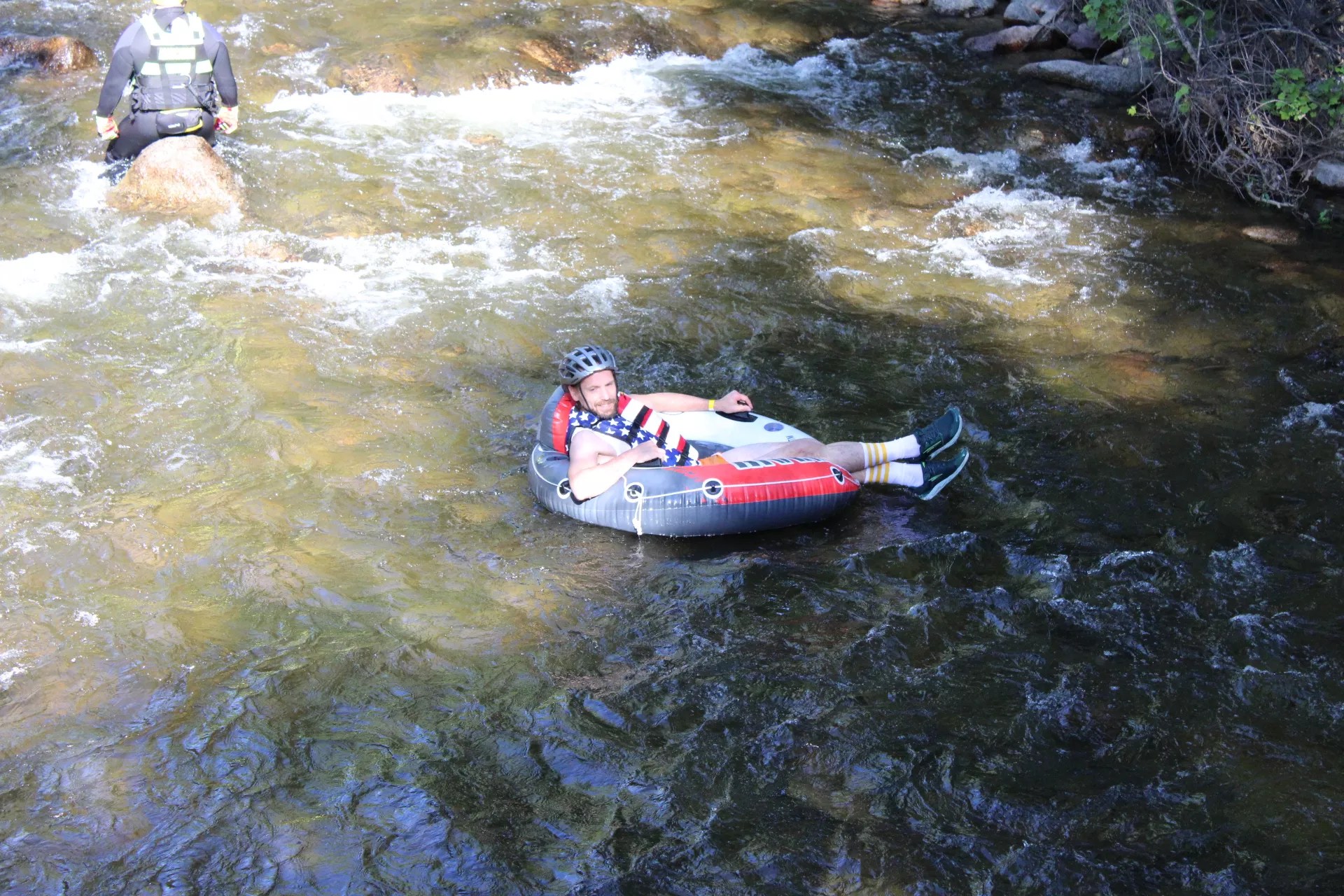 A man floats the Boulder Creek during the 18th Tube to Work Day.