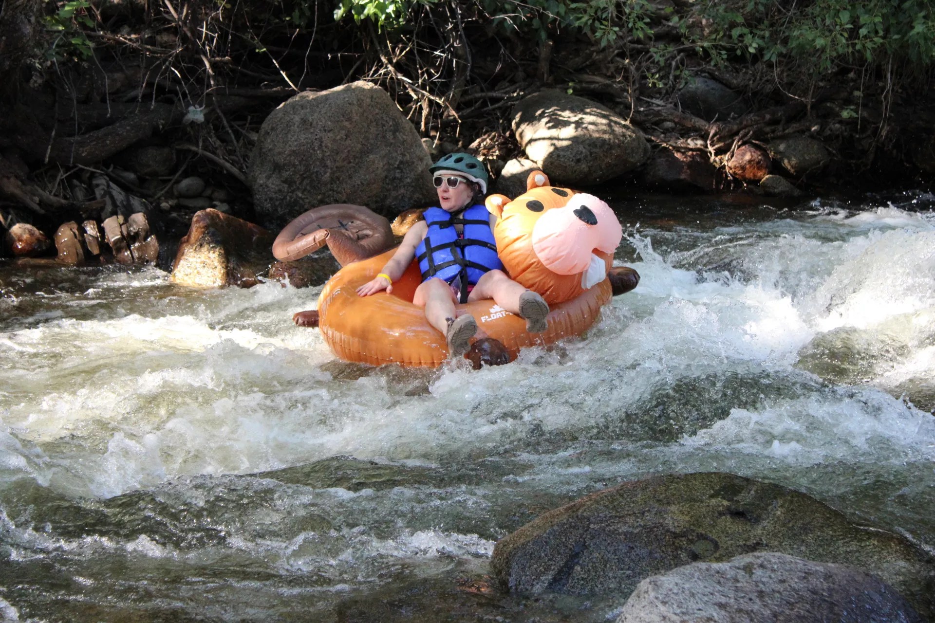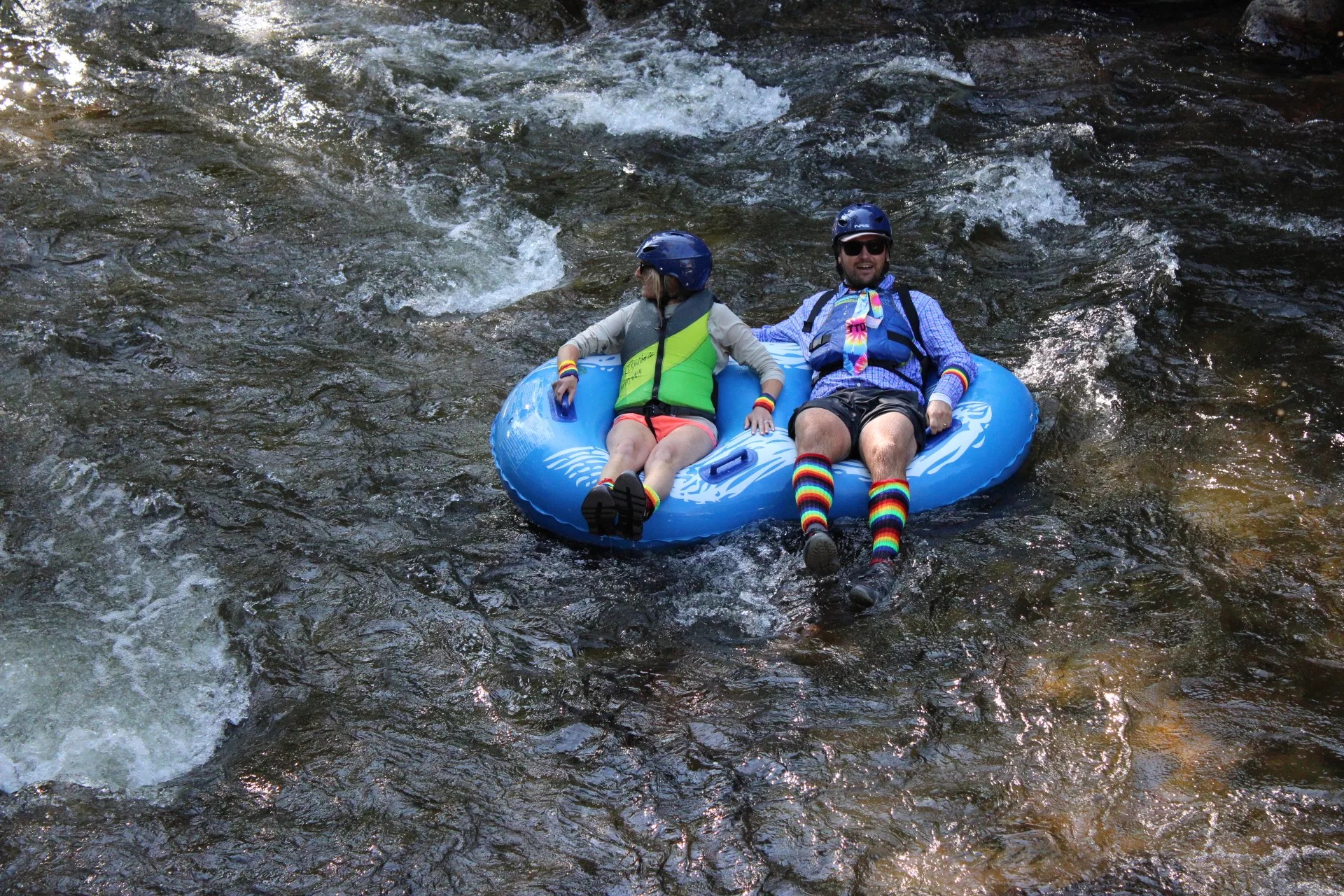 Two people in a double inner tube float down Boulder Creek.