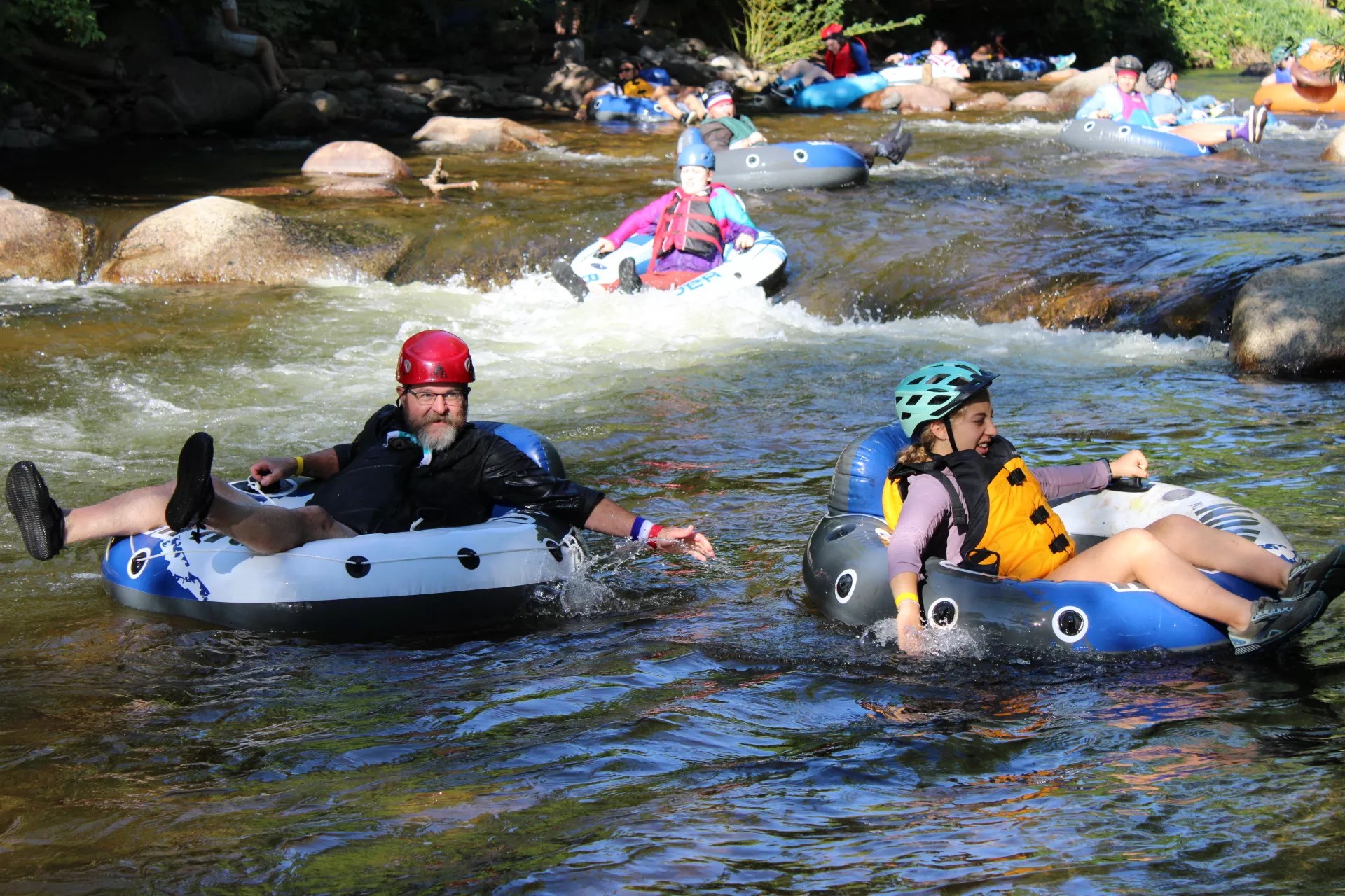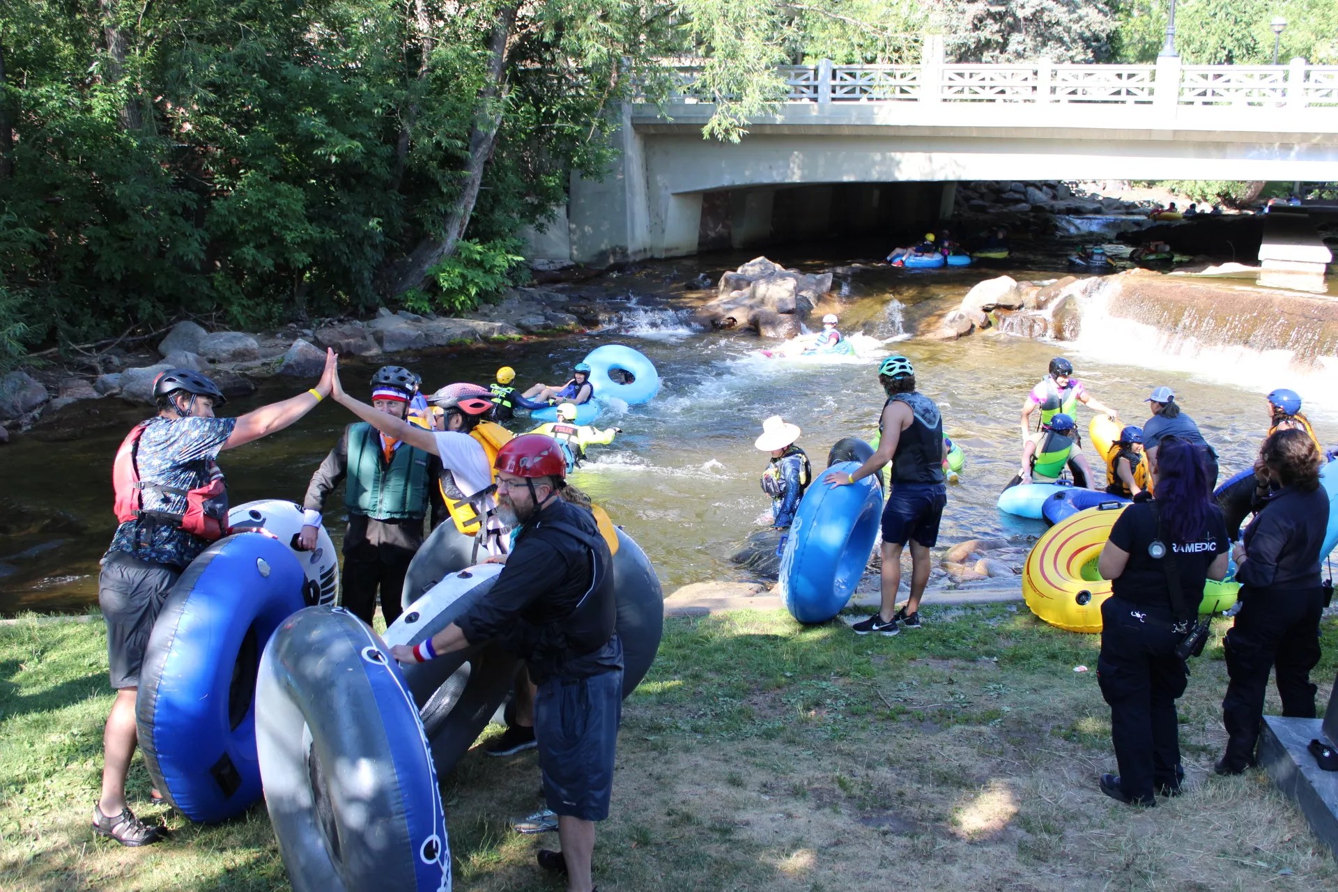 People leave Boulder Creek at the end of the 18th Tube to Work Day near Central Park.