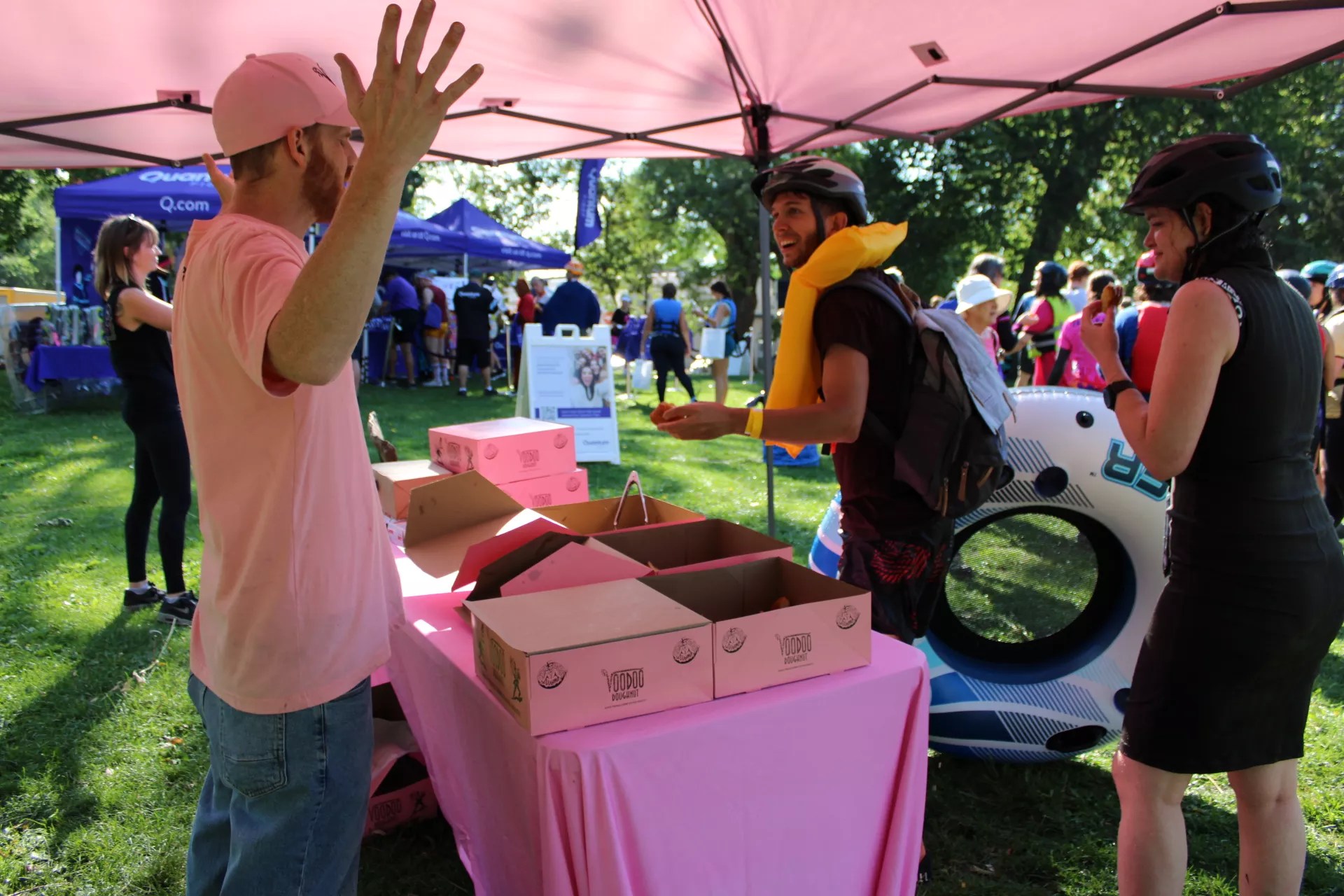 Spectators along the route handed out Bloody Marys. People tossed powdered donuts from bridges near the library. A few surprised passersby shouted encouragement from the bank. For many, the event’s highlight came at Central Park, where the tubing route ended with hot coffee, breakfast bites and a dance party led by DJ Superstar Duck Low Rock.