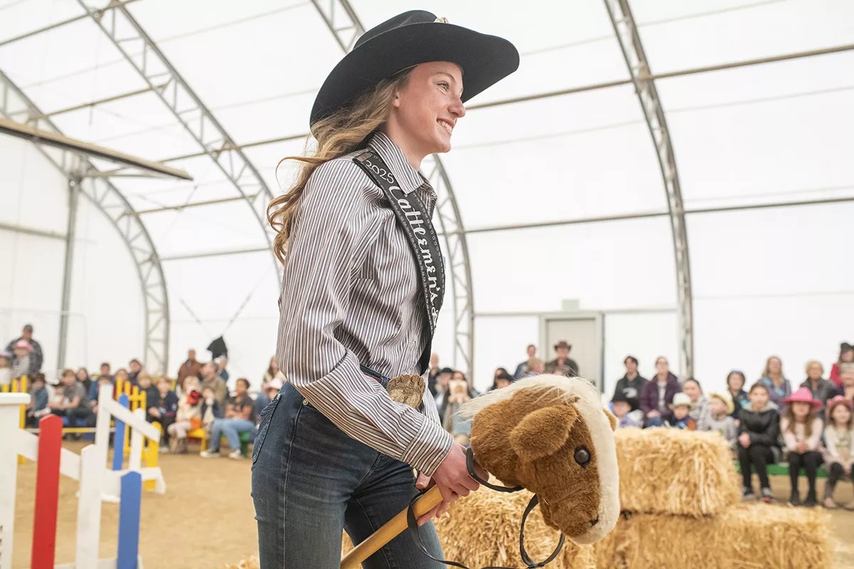 A rodeo queen tests out the course for the “stick horse” Grand Prix.
