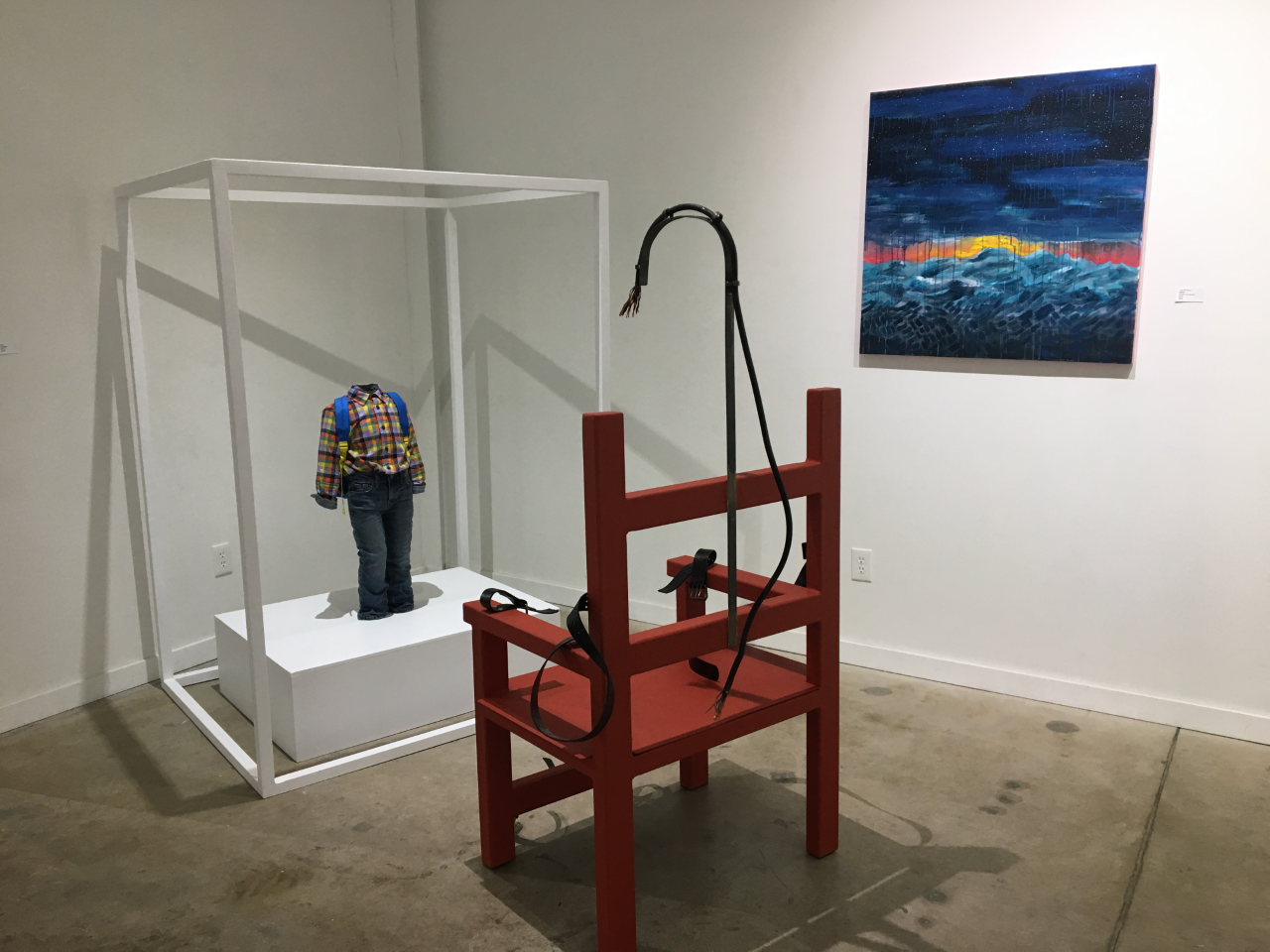In the main space, where the members have their works, are two installations and quite a bit of sculpture, which may be why this area doesn’t work as well visually: As big as the back gallery is, it’s just too crowded. But I like a lot of what’s in this section anyway. Julie Jablonski’s charred front door is suspended from the ceiling, dividing the room into mini galleries. Weird representational pieces, essentially examples of conceptual realism, create something of a show within a show: There’s the pseudo-death chamber with headless child and an electric chair by BUG; Walter Barton’s papier-m’ché figure of a woman with a ship substituting for her head; the white plaster woman’s head coming out of a cardboard box by Justine Beard; and Brian Cavanaugh’s strange planter pierced by a shovel.