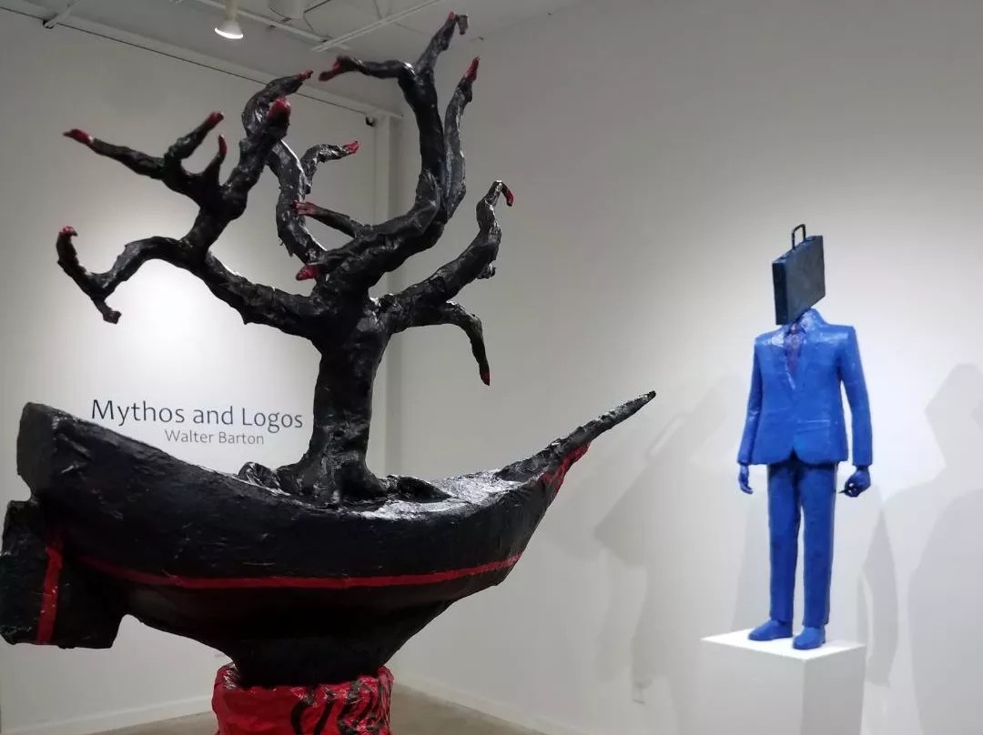 Barton uses papier-m’ché laid over an armature, which is charmingly modeled into the figures in an approach that is simultaneously naÁ¯ve and sophisticated, then paints them. The results are nearly life-sized statues meant to illustrate Barton’s own thoughts and feelings. He indicates this by his clever replacement of the heads with recognizable objects, such as a briefcase in “Terms and Conditions” or antlers in “The Scholar,” giving them all a pop-surrealist vibe.