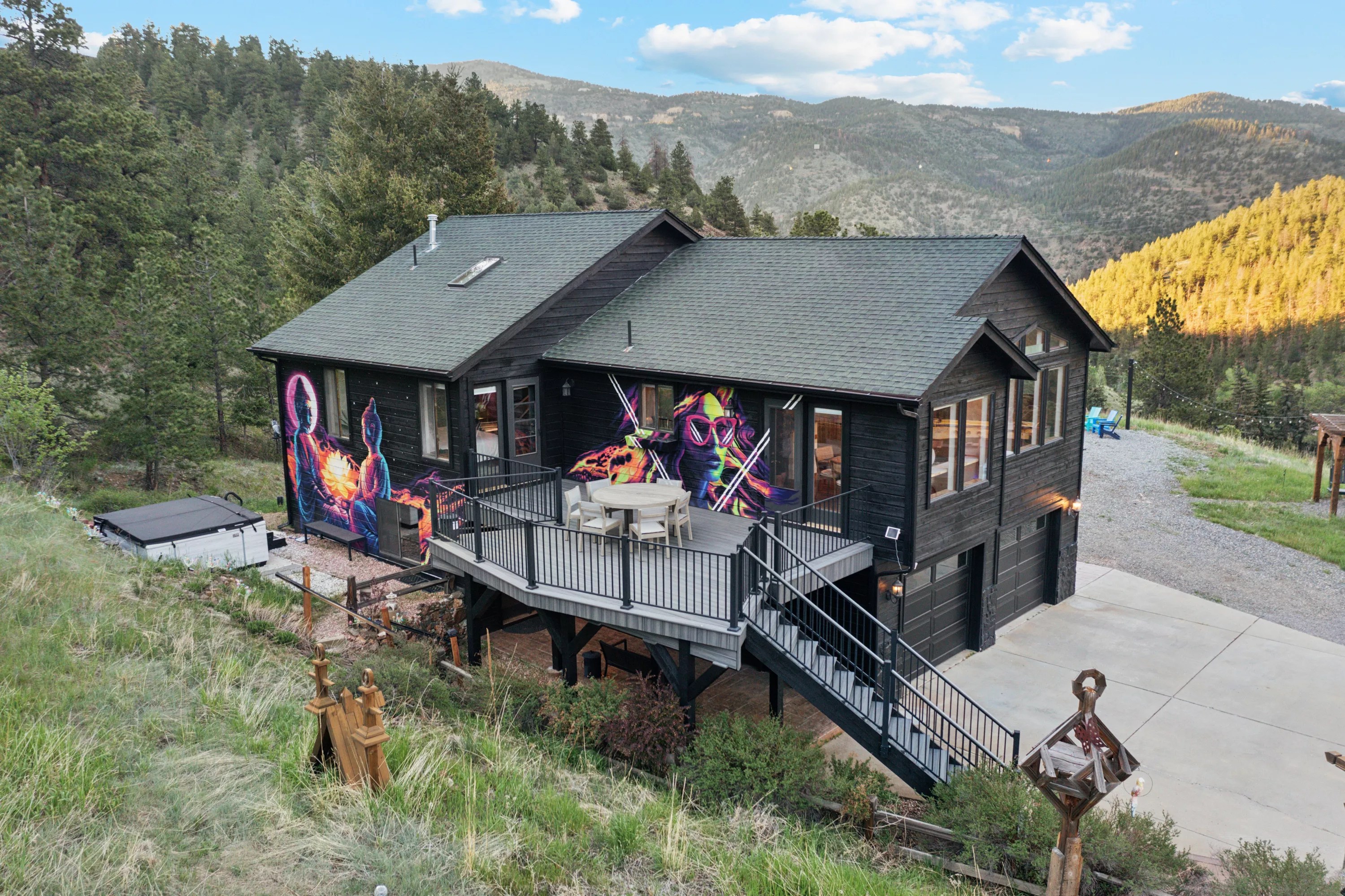 The result of that dream, at least so far, is Hummingbird Hill, a three-bed, three-bath mountain Airbnb only five minutes from Interstate 70 near Idaho Springs, designed for families, small groups, corporate retreats, weddings and more. The house sits on thirteen acres of peaks and valleys, and the immersive art now concentrated on the home itself is just starting to creep up the hillsides.