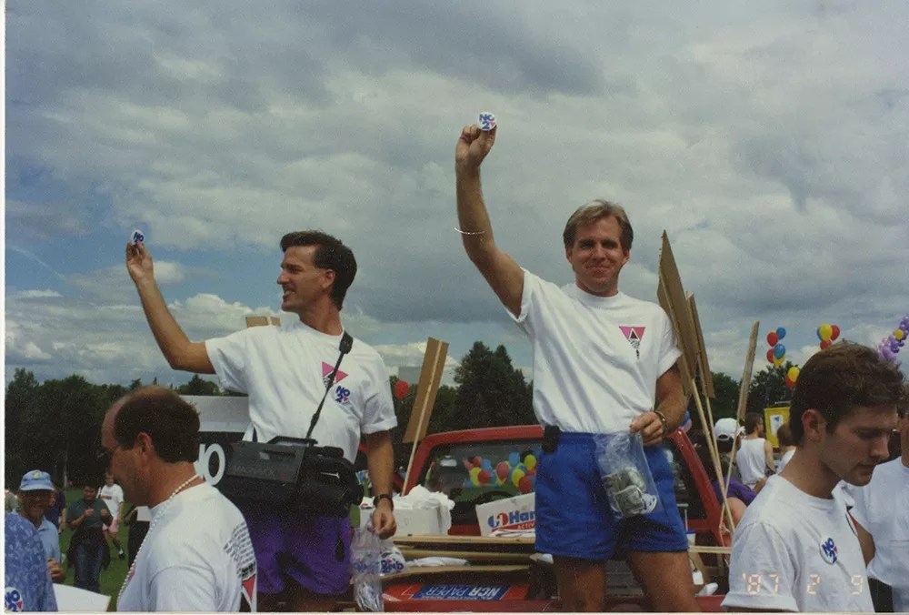Colorado activists Tim Robinson and Frank Brown sell “No on 2” buttons at the March on Washington in 1993.