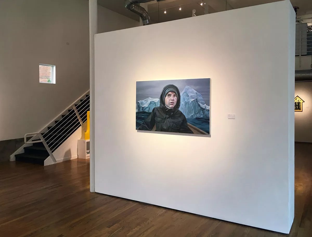 The lineup begins with a section of the gallery given over to Wes Magyar, which is made up of contemporary realist paintings by well-known Colorado artist Wes Magyar. Several are informal portraits that carry the suggestion of some unknown and enigmatic narrative. In “The Call,” an oil on canvas, a young man in a hooded parka appears to be sitting in a rowboat heading for an iceberg that looms behind him; in “Collect,” a businessman in a suit and tie is caught holding a bundle of twigs as he walks down a skyscraper-lined street.