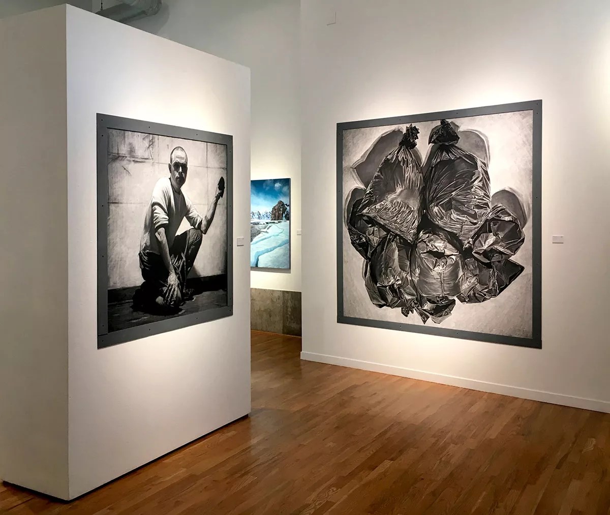 The last of the solos, which begins on the main level but is mostly installed on the mezzanine, is Shelby Shadwell, dedicated to another Wyoming artist who does remarkably precise photo-realist charcoal-on-paper drawings. In a figure study in the form of a self-portrait, Shelby Shadwell depicts himself as a street kid squatting in front of a wall. Although the charcoal has been clearly applied in fluid gestures, with some of the qualities of a quick sketch, the feel for accuracy is nearly photographic. The gritty urban look of this piece is pushed further in Shadwell’s other works, a spectacular series of incredible still-life images of tied-up black trash bags that have a magisterial monumentality despite their humble subject. The quick-sketch character of the self-portrait is even more pronounced here, as the artist puts a slashing line here, thick even strokes there – and somehow the result looks almost like a photo.
