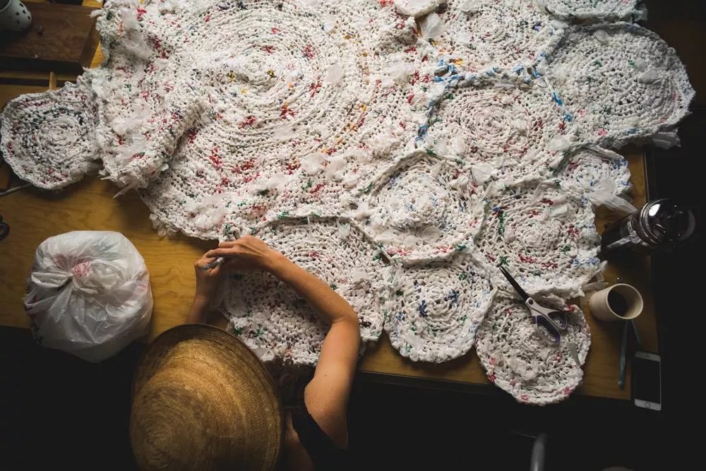 In contrast, Viviane Le Courtois’s participatory outdoor installation “Dirt Soup,” involves several human elements, beginning with a canopy of woven plastic bags created with the artist before the exhibit by community members. During the September 16 opening at the Land Library, Le Courtois will serve soup in homemade clay bowls beginning at 7 p.m., inviting people to slow down and sit together, sans electronics and the Internet, over a simple dinner, to talk face-to-face about climate change and whatever else is on their minds.