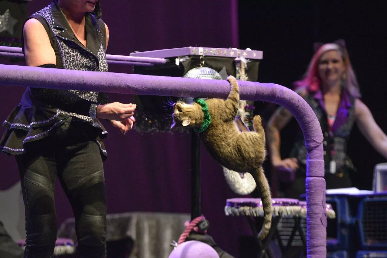 The final act is Tuna and the Rock Cats, billed as the only all-feline band in the world. Each cat is placed in front of an instrument, like a guitar, drums or piano, and either paws at it or gets treats strategically placed in the mouthpieces, as was the case with the new Jazz Cats on trumpet and clarinet. Sound effects are overlaid for comedic effect, like a saxophone solo timed with the cat “playing” Careless Whisper.