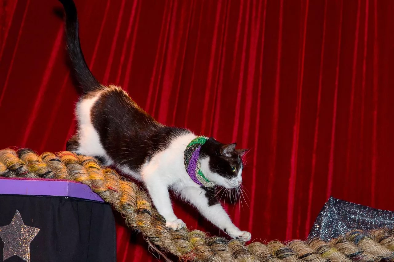 For the uninitiated, The Amazing Acro-Cats is a one-of-a-kind circus-meets-cat-rescue-meets-music-extravaganza created by animal trainer Samantha Martin. The show features clicker-trained domestic rescue cats who ride skateboards, leap through hoops, balance on beams, walk across ropes and close out the performance by “playing” in a rock band. It’s chaotic, adorable and surprisingly educational.