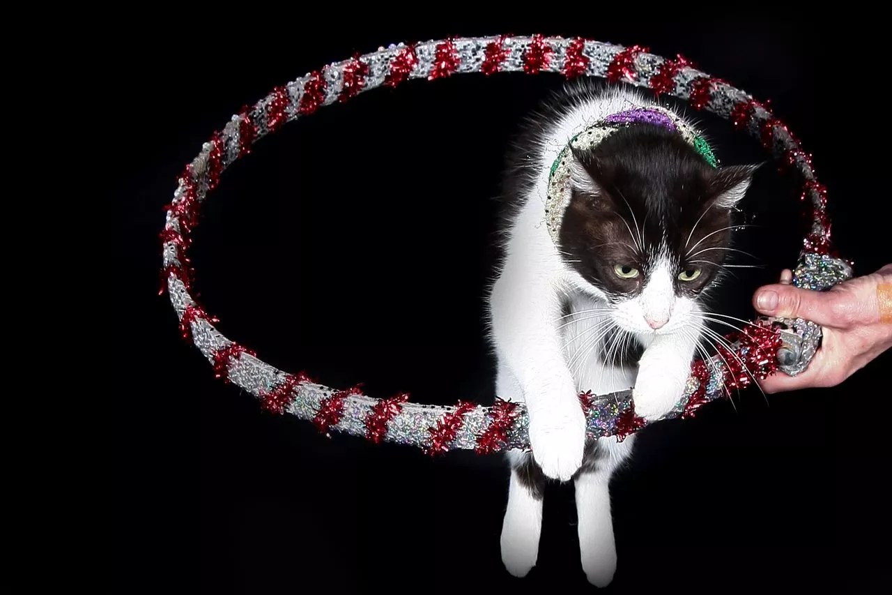 An Acro-Cat jumps through a hoop. Courtesy of The Amazing Acro-Cats
