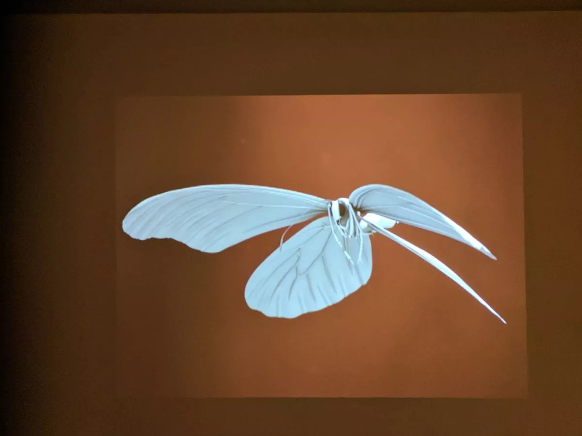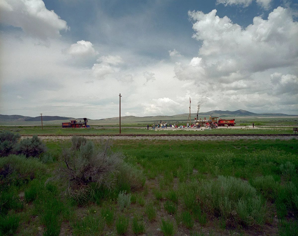 Beyond the atrium is one of the most unusual sections – in a show with a lot of unusual things. Here are the “Madame Eroshenko” photos of a deformed butterfly, paired with a video of a computer animation of it, all by Yoshitomo Saito. This work is somewhat unexpected, since Saito is known as a bronze sculptor – but just like his three-dimensional pieces, these are sublime. Saito shares the gallery with two artists, including Sonja Hinrichsen, who’s famous for her snow drawings, in which footprints are used to create patterns that are photographed from above with drones. A few representations of the finished works are displayed, along with a video of volunteers making the marks. In the opposite corner is a narrative documentary about an organic farm in Hawaii, along with some stills, by Dana Forsberg. “Meeting at Promontory Summit,” by Edie Winograde, Archival inkjet print. Courtesy the Arvada Center