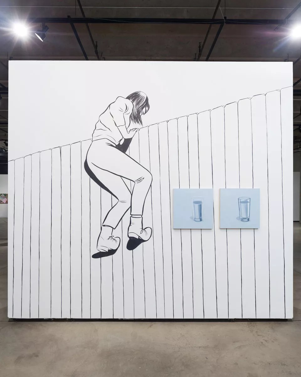 In a show this large, it’s impossible to account for every thoughtful piece – but let me give a last-minute tip of the hat to several more. Sarah Fukami’s appropriated prints of Japanese relocation-camp photos by Ansel Adams are very engaging. George P. Perez’s ruminations on the concept of originality and whether a Seattle artist stole his visual language are more than a little intriguing. The graphite drawings of overspray by Dustin Young are genuinely beautiful and provocative. And finally, the mural by Molly Bounds depicting a woman climbing a fence, with a pair of easel paintings of glasses of water hanging on top, is out of this world.