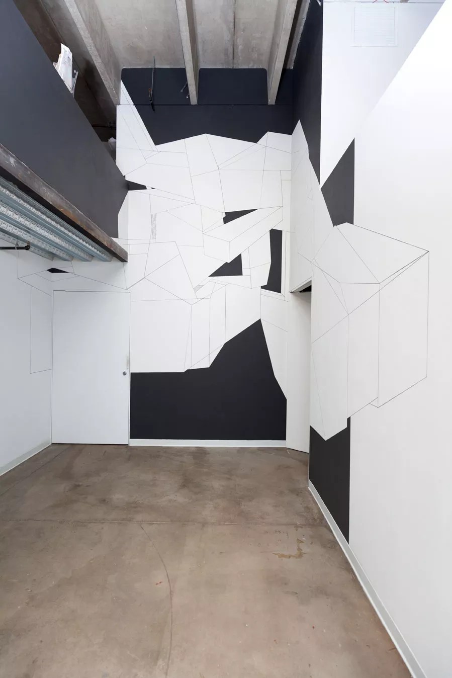 “Vacant Land Can Be Deceptively Complicated,” a wall painting by Ramón Bonilla, is in the niche to the right. Made up of hard-edged intersecting shapes done in black on white, it wraps around three sides of the niche. You can see how it dovetails with his day job at the Denver Urban Renewal Authority, since these shapes could be lot lines, as implied by the title – but it also exemplifies Bonilla’s signature constructivist style. Occupying another niche on the other side is Andrew Huffman’s “Locus-Projection,” an installation made of neon-colored strings stretched in a stack across the corner of the space; like the Zoots and the Bonilla, it only tangentially relates to the organizing theme.