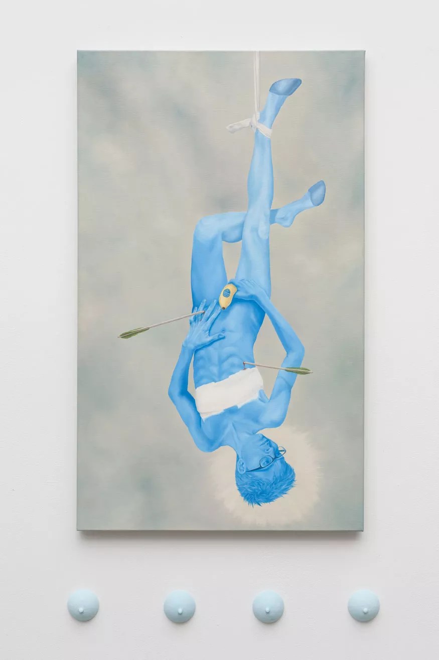 Opposite that installation is Tracy Tomko’s “The Fruiting Body,” an oil-on-canvas self-portrait that fully embraces McGowan’s concept. In the piece, Tomko is trussed up, hanging upside down with her torso punctured by arrows, Á la depictions of Saint Sebastian; her breasts are bound, and on the wall below the painting is a row of cast-sugar breasts. This piece is a direct response to the artist having recently been called “sugar tits” while at work in a factory, and the painting expresses her desire to mask her gender and thus pass as a man. It’s a knockout.