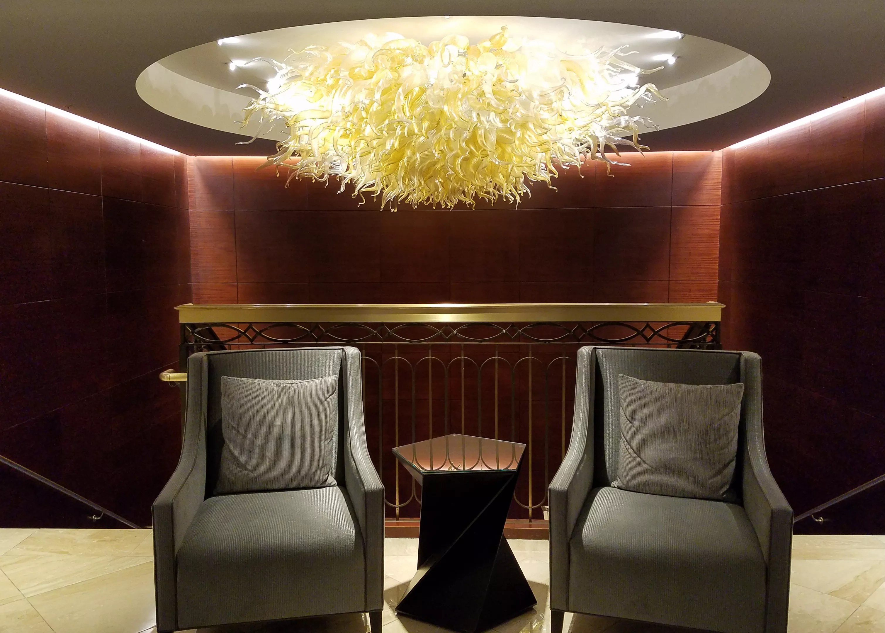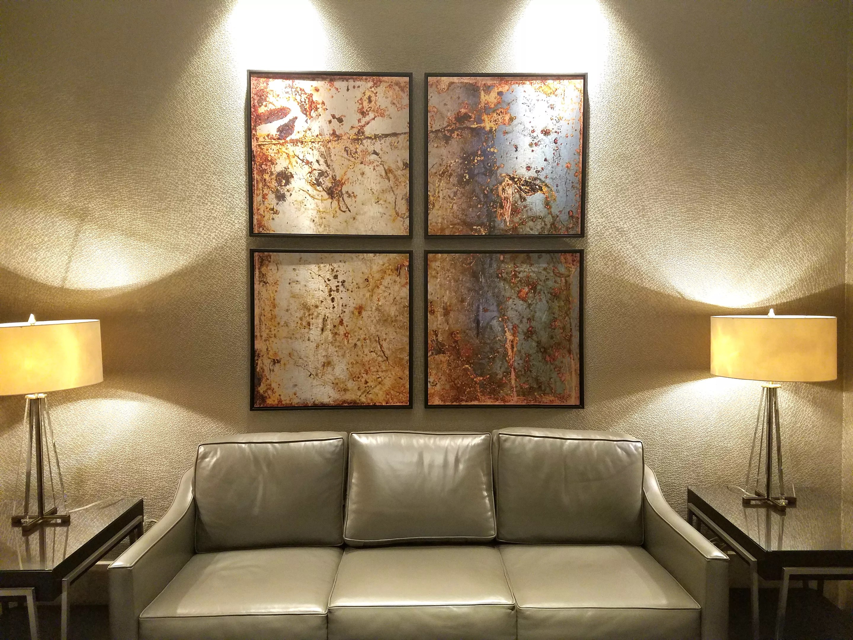 Also in this lobby is a piece from the “Rust” series by Madeleine Dodge. The Denver-based artist created the four-piece work out of a raw steel square found among her mother’s things after she passed away in 2006; Dodge buried the plate behind her family home in Oklahoma, and over time, it naturally corroded into a mesh of rusty red, orange, ombre and shades of silver. With each stage of decay, Dodge digitally photographed the plate. What you see at the Ritz-Carlton is one of those photos, which was transferred onto canvas and cut into four unique works. Though not new, the stunning chandelier by Robert Kuster got a good cleaning and new lighting. Linnea Covington