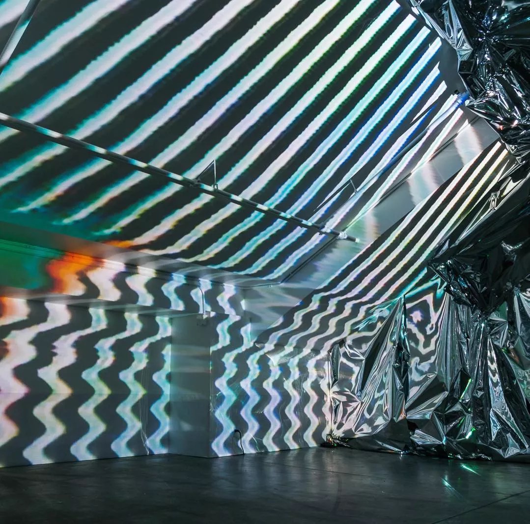 We built a narrow structure in the Understudy space that looks completely different from the usual building. There’s one projection that’s almost unaltered and another projection that’s reflected through the mirrored interior of the space. There is also a modulation of light and motion happening around the structure, setting the mirror foil into motion in a sparkly space that vibrates and breathes and transforms over time.