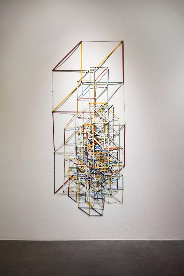 Among the handful of larger Larsen works is the impressive “Half Naked.” Larsen has built a complicated skeletal form that changes scale as it rises. Perched on a perfectly executed plywood plinth are large, stepped outlines of rectangular shapes, followed by constructions made of smaller elements that get tighter and tighter. The ins and outs of the linear composition seem to metastasize off one side, lending the piece a precarious profile. More stable in appearance is a large wall piece, “Daily Special,” that looks like flattened three-dimensional solids.