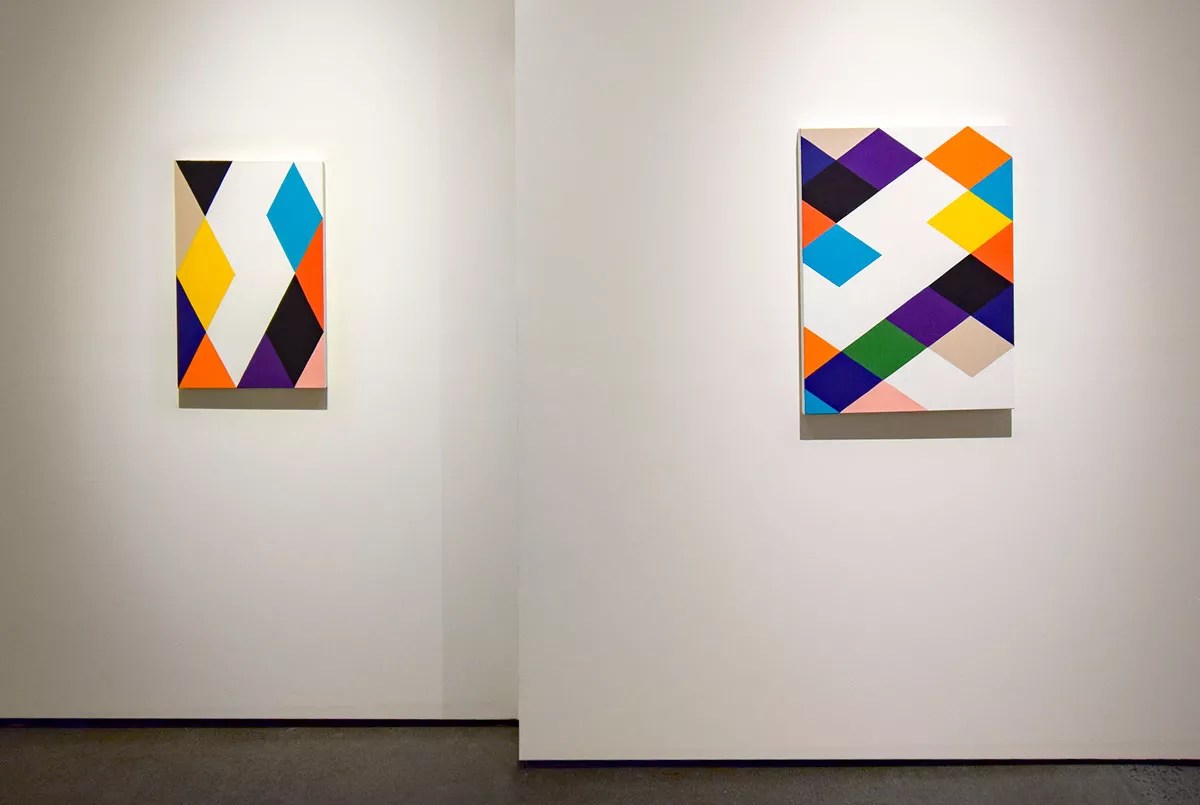 In the central space, the group show Radial includes some choice paintings by Stephen Westfall, Don Voisine and Kate Petley, who all use geometric shapes to build their compositions. Both Westfall and Voisine are interested in creating simple arrangements of rectilinear shapes and manipulating the illusion of three-dimensionality, so that some parts of the patterns seem to recede into space behind the picture plane on which the other parts sit; it’s kind of a clever take on the classic figure-to-ground relationship of realist paintings. The Petley paintings – in particular, the majestic “Unsayable Lights” – also have that figure-to-ground component, but Petley’s approach is quite different from that of Westfall and Voisine. They paint precisely, and Petley is expressive; her blocky shapes have wavering lines and were done without the use of straight-edges. “Del Parto” and “Arabesque,” by Stephen Westfall, oil and alkyd on canvas. Courtesy of Robischon Gallery