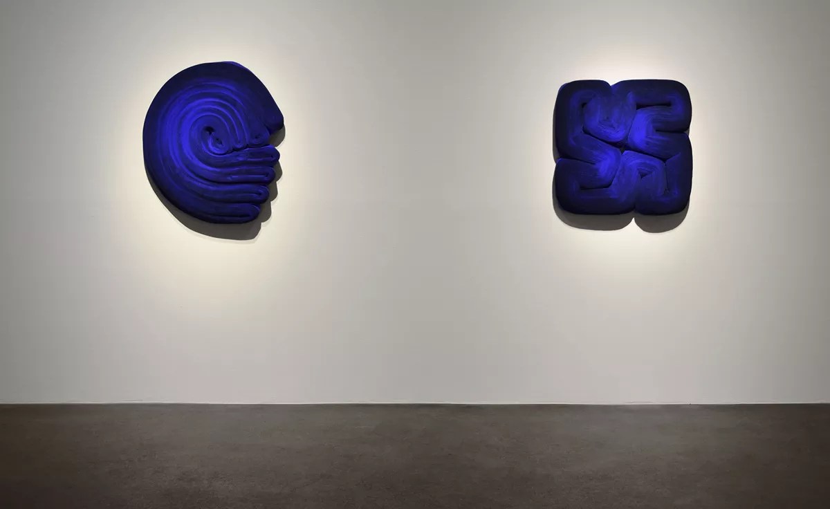 Other Velasquez pieces here seem to pick up where those at MCA Denver leave off, including a handful of works from his “Preservation of the Monument” series, which are closely aligned with his gold-molding installation in the MCA atrium. Though it could be argued that Velasquez’s form-finding vinyl works are architectonic because they’re based on tensile concepts, his interest in buildings is even more clearly expressed in these works, which employ cheap, ready-made cast moldings whose original purpose was to add a tawdry, ersatz traditionalism to a building. In “Imperfect Future,” Velasquez has created a Greek key pattern out of the molding that runs across the floor; a similar pattern is used for “Ultimate Trace,” a wall-mounted sculpture. But the tour de force of the “Preservation of the Monument” pieces is “Tall Field,” a wooden column with the moldings, painted bright blue, lined up vertically inside the concave interior of the column.