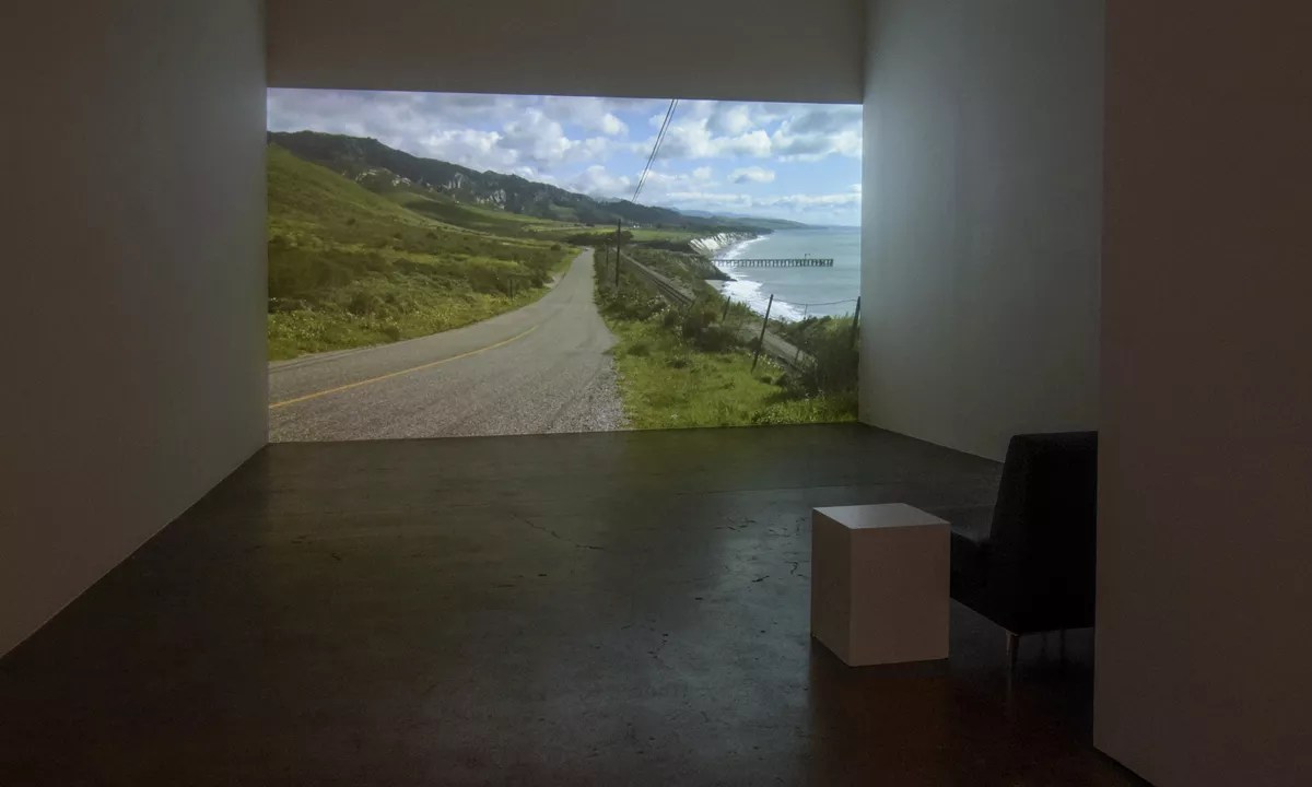 The same spirit of contemplation is seen in James Benning: small roads, a video projection in the large back gallery. James Benning, a well-known filmmaker, recorded his trip on back roads from California to Louisiana. The roads look alike, with fields encroaching on the two-lane black top, and the hour-long film appears to comprise straight, unaltered shots. But it turns out that Benning uses digital technology to alter what he records, and has written that “the equipment can take you in either direction – to the total abstracting of the image or towards a much closer reality.” Here we’re looking at what Benning views as a “collage,” in which he has invisibly overlaid or otherwise inserted different effects, such as adding rain to the scene. He does it so perfectly, however, that when he’s finished, the filmed road looks completely real.
