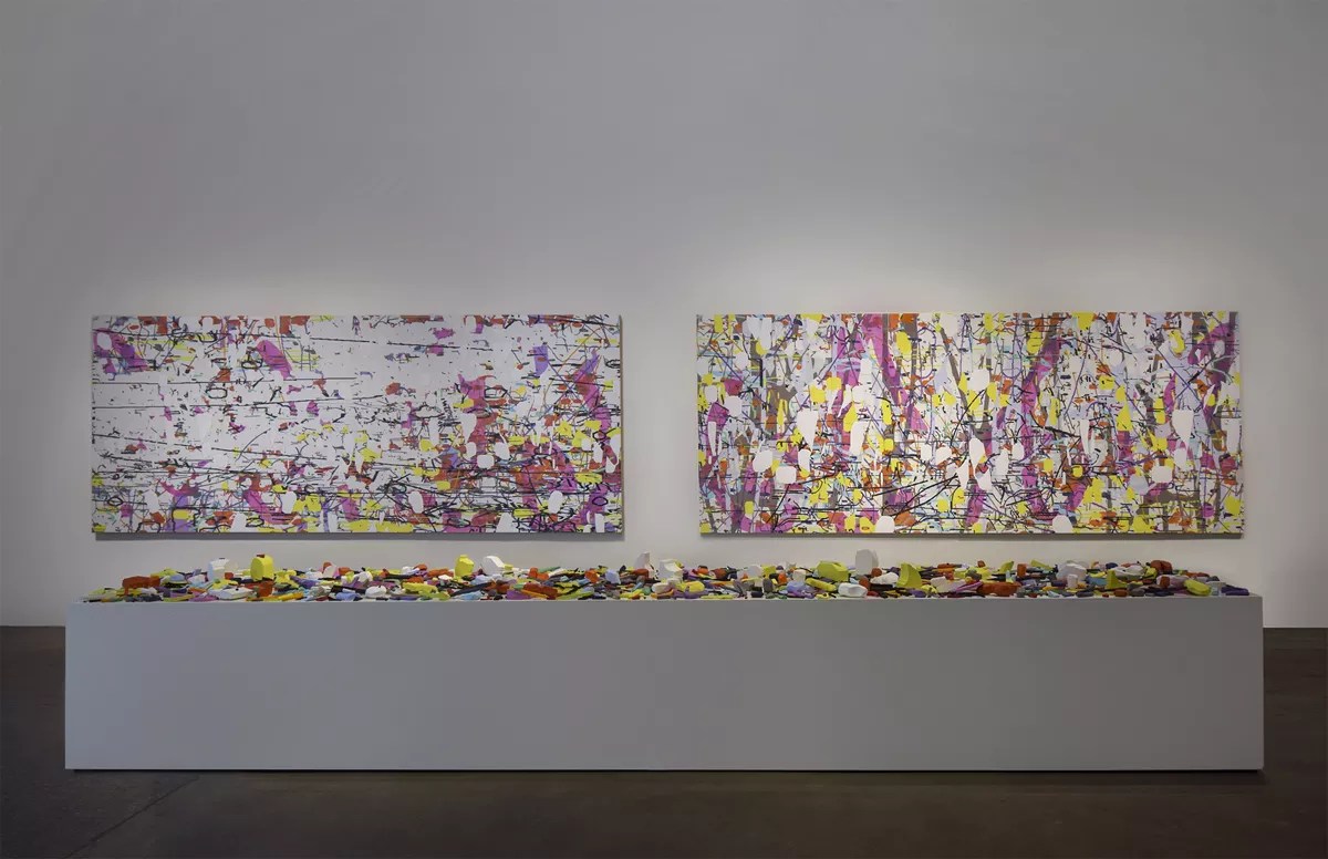 Though everything in the Ellingson show is well conceived and finely crafted, you can’t help but be drawn to the pair of enormous horizontal paintings, “Variation Part I” and “Variation Part II,” which have been hung side by side. Both have white grounds, with a predominating pink accented by black, yellow and lavender. At first they have a scribbled character, but as you look closer, this is apparently intentional, since the components appear to be floating at different levels below the surface: Coats of transparent encaustic were applied over the oil paint, which also lends the paintings their waxy glow. The installation “Variation: Artifact,” which is displayed on a long stand, is the perfect counterpoint to the paintings. The San Francisco artist has cast the shapes seen in the paintings in colored encaustic, turning them into three-dimensional objects.
